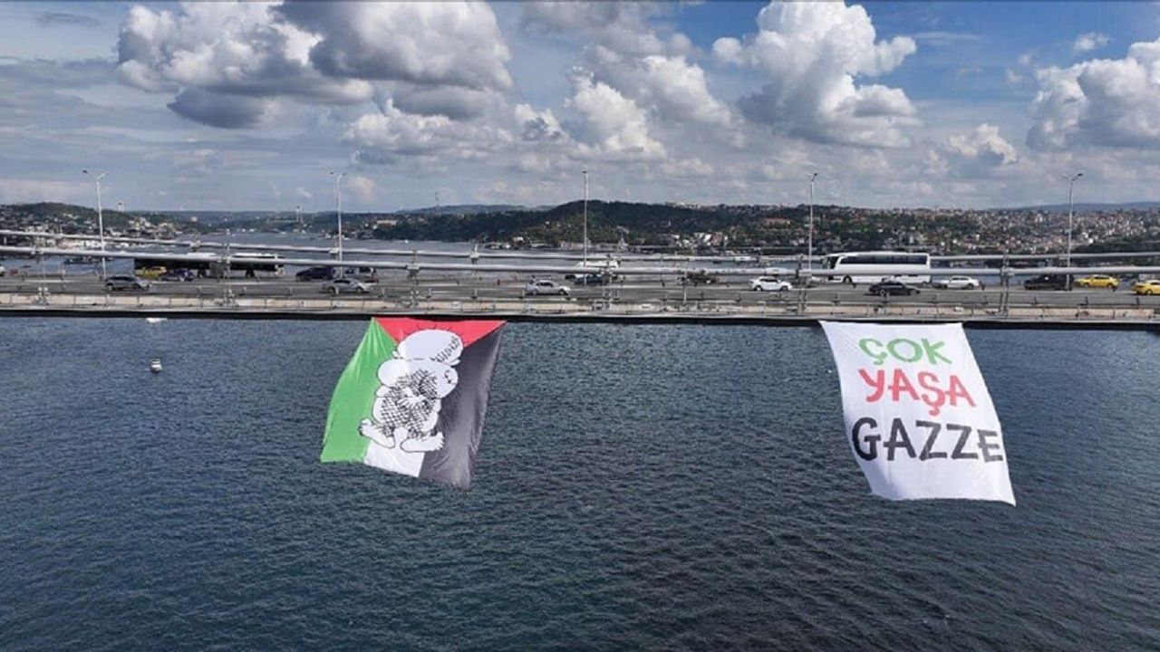 Her gün binlerce aracın geçtiği köprüye 12X18 boyutlarında asılan bayrak, vatandaşların dikkatini çekiyor.