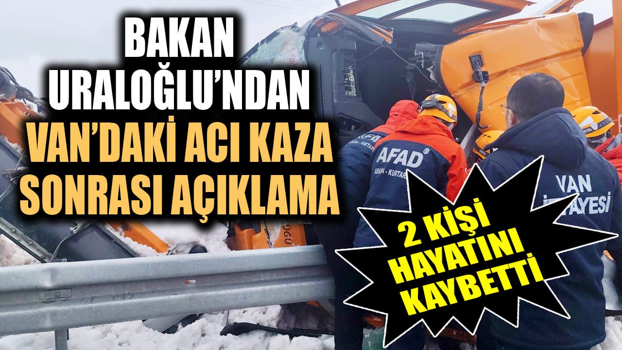 Ulaştırma ve Altyapı Bakanı Abdulkadir Uraloğlu mesajında, “Van’da karla mücadele çalışmaları esnasında geçirdikleri kaza sonucu hayatını kaybeden Karayolları Genel Müdürlüğü çalışanlarımıza Allah’tan rahmet; kederli ailelerine ve tüm Karayolları camiamıza başsağlığı diliyorum. Mekânları cennet olsun” ifadelerine yer verdi.