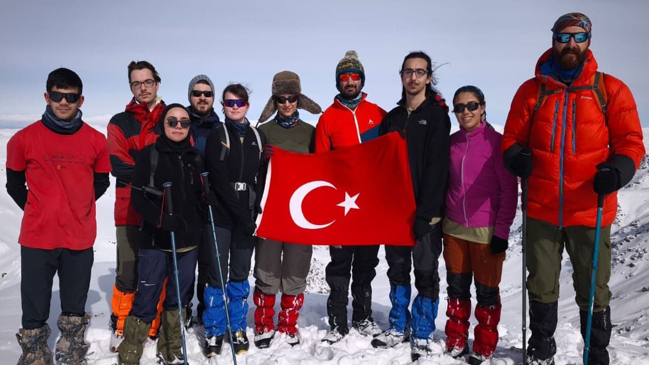 Zorlu kış şartları altında gerçekleştirilen tırmanışta, 3 bin 204 metre yüksekliğindeki Erek Dağı zirvesine ulaşan dağcılık ekibi, deprem şehitlerini saygı ve rahmetle andı.