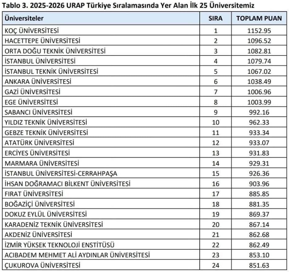 Dünya genelinde üniversiteleri akademik performanslarına göre sıralayan prestijli URAP (University Ranking by Academic Performance) kuruluşu, 2025–2026 dönemi Türkiye sıralamasını açıkladı.