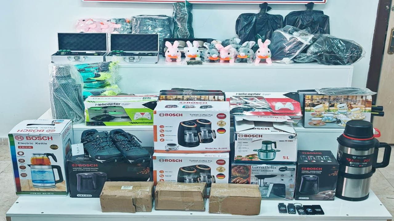 Ele geçirilen malzemeler arasında 1 adet Bosch marka elektrikli kettle, 4 adet Bosch marka kahve makinesi, 1 adet Bosch marka blender, 1 adet Stanley marka termos, 1 adet Travel Pot marka termos, 1 adet Vacuum marka termos, 1 adet Lumabelle marka kıyma çekme makinesi, 22 adet oyuncak, 4 adet kutu kahve fincanı, 6 adet şemsiye, 6 adet el aleti, 80 adet muhtelif giyim malzemesi bulunduğu bildirildi.