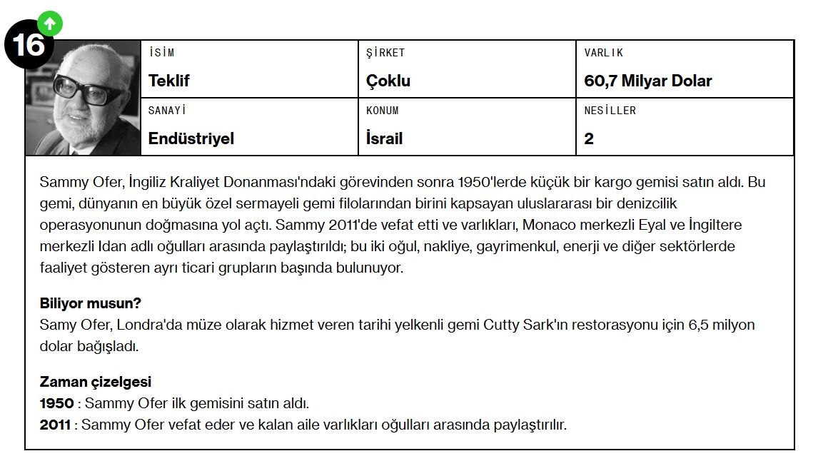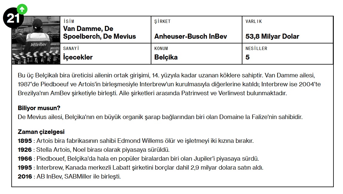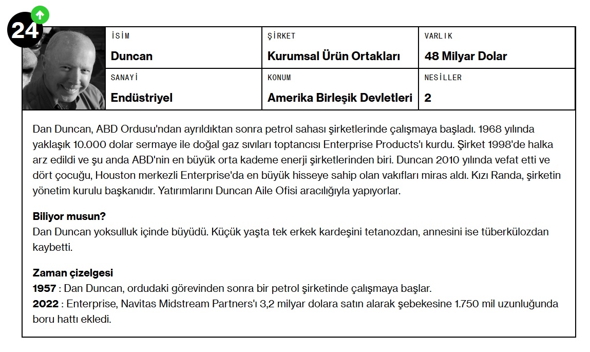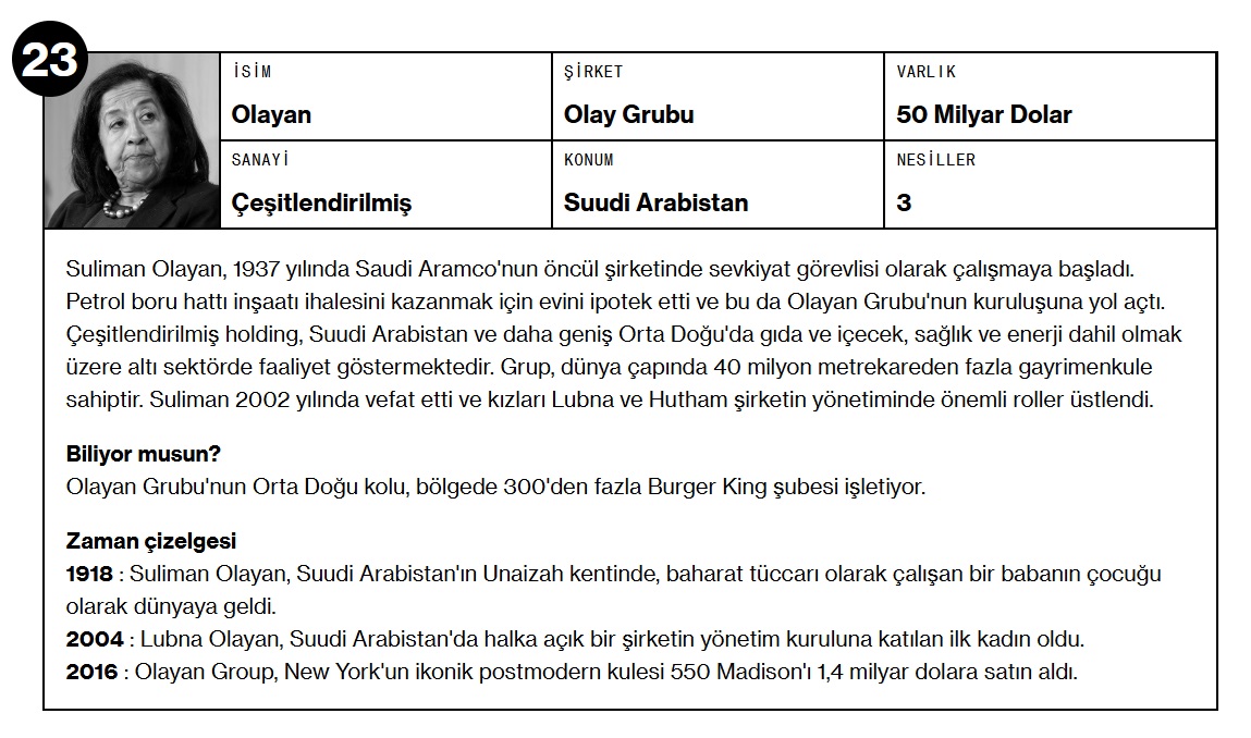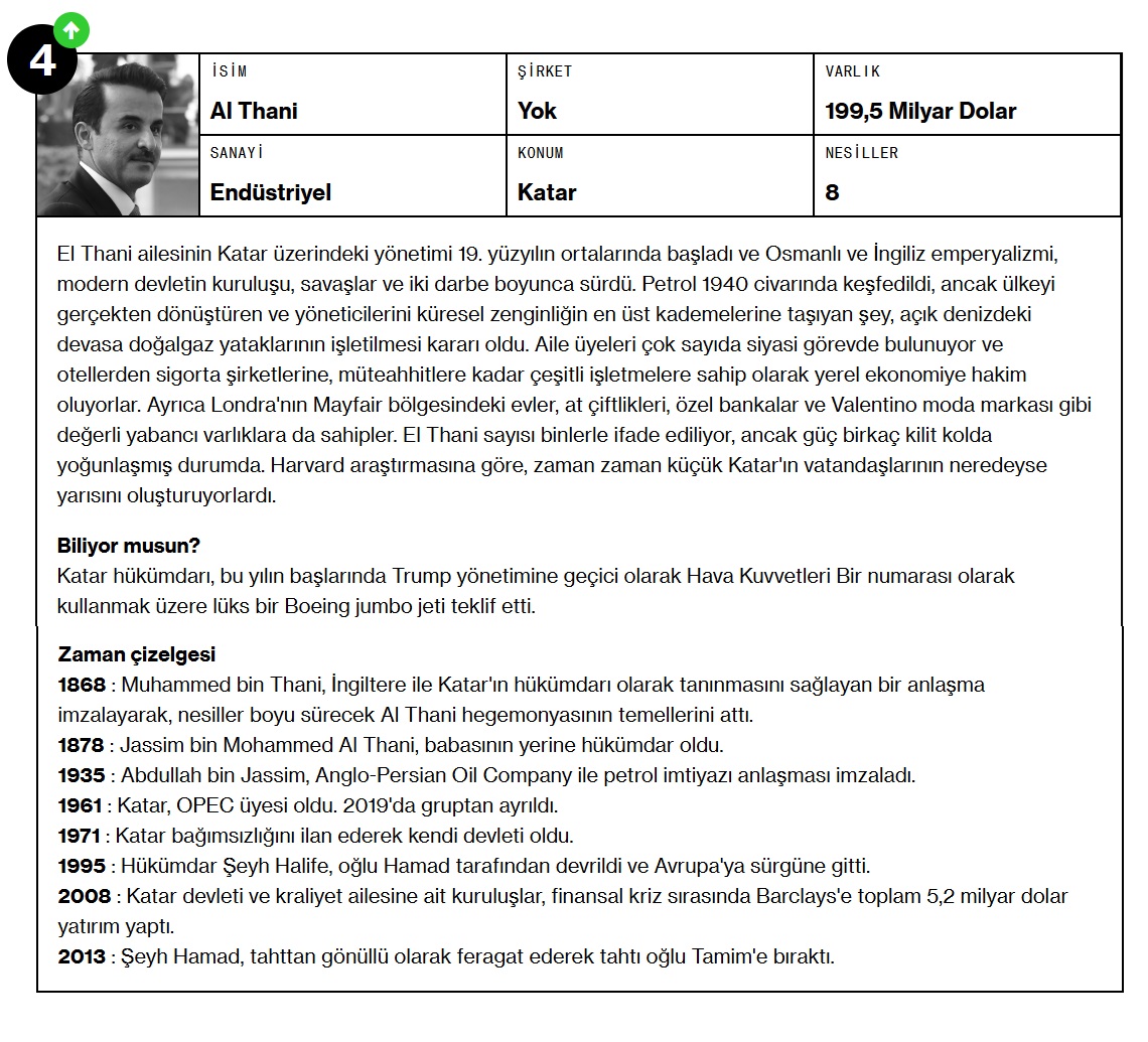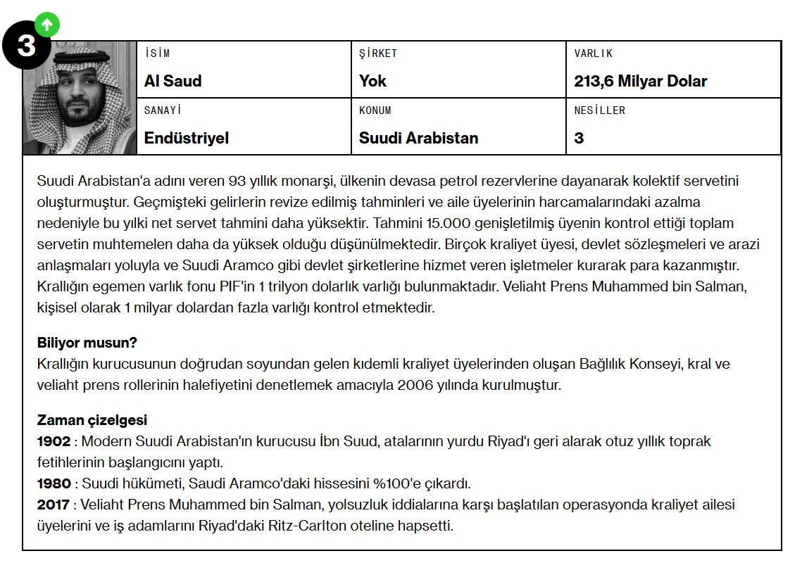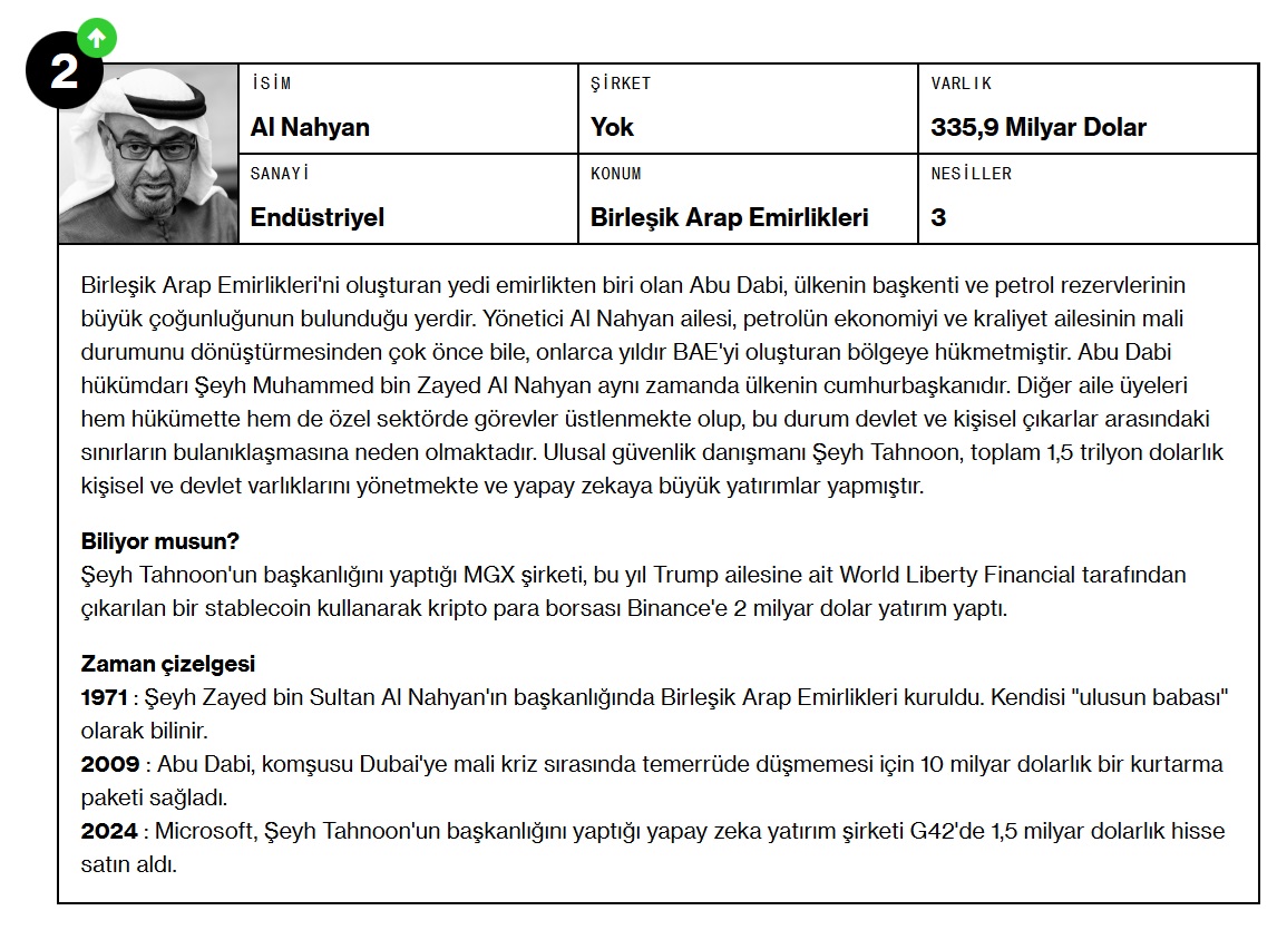 Listenin en başında, yıllardır olduğu gibi Walmart’ın kurucuları olan Walton ailesi yer alıyor. 513 milyar doları aşan servetleriyle rakiplerine büyük fark atan aileyi, Birleşik Arap Emirlikleri ve Suudi Arabistan'ın yönetici aileleri takip ediyor.