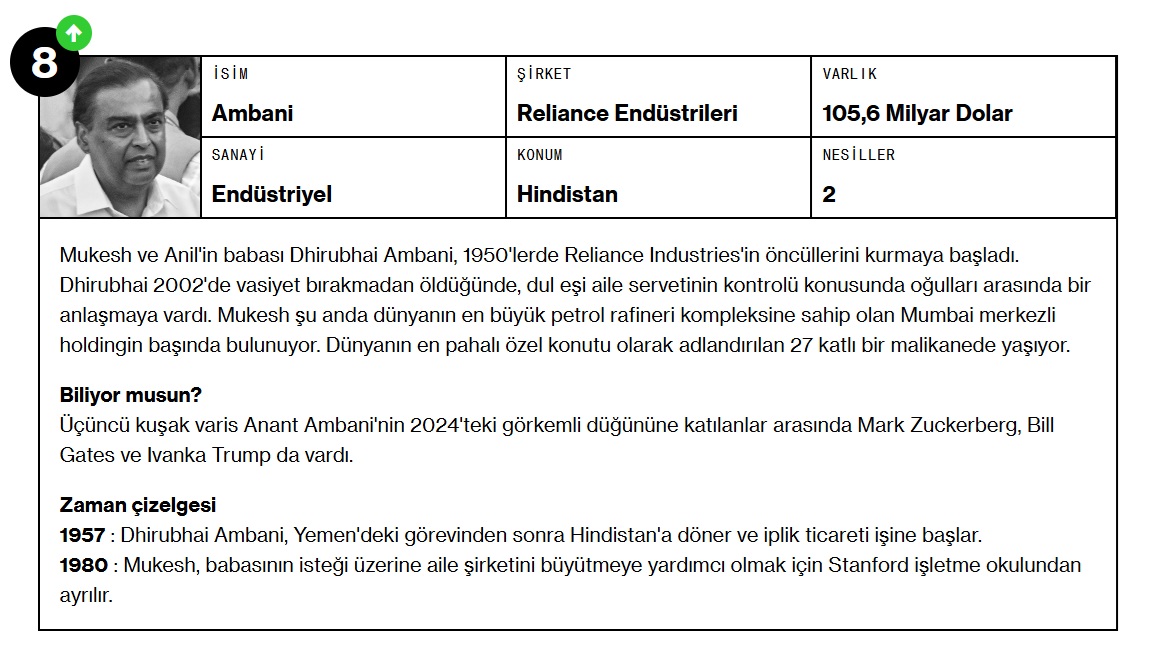 Hindistan’dan listeye girmeyi başaran tek aile, Reliance Industries’in sahibi Ambani ailesi oldu. Enerjiden perakendeye kadar her alanda devleşen aile, 105,6 milyar dolarlık servetiyle Asya’nın ekonomik gücünü temsil ediyor.