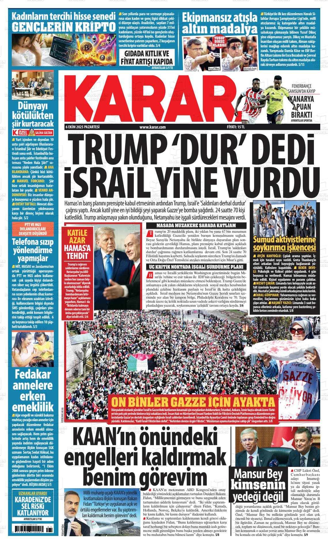 06 Ekim Pazartesi 2025 tarihli manşeti; KARAR gazetesi ilk sayfası