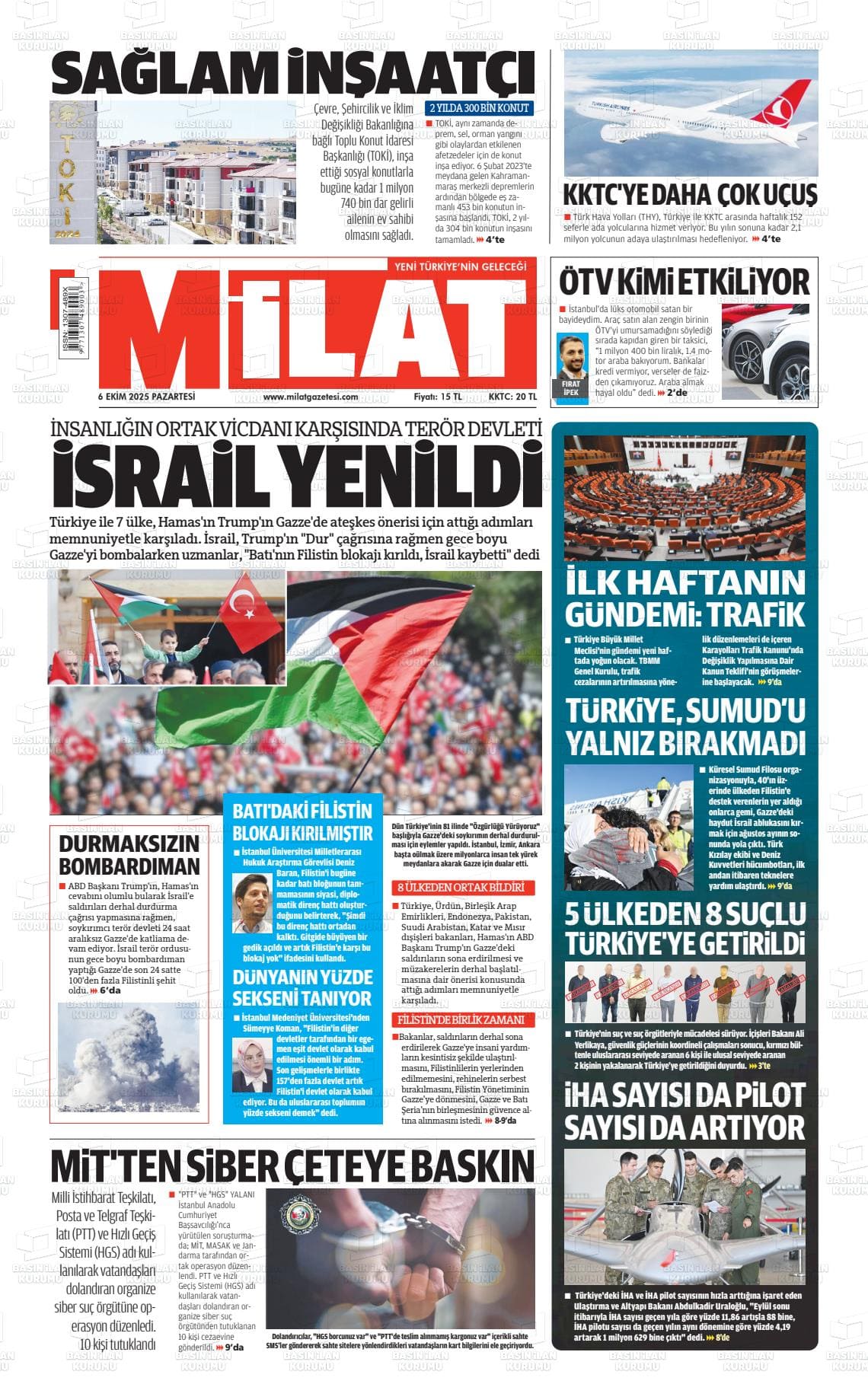 06 Ekim Pazartesi 2025 tarihli manşeti; MİLAT gazetesi ilk sayfası