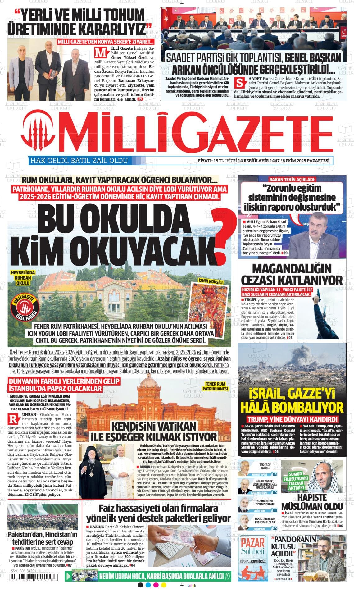 06 Ekim Pazartesi 2025 tarihli manşeti; MİLLİ GAZETE gazetesi ilk sayfası