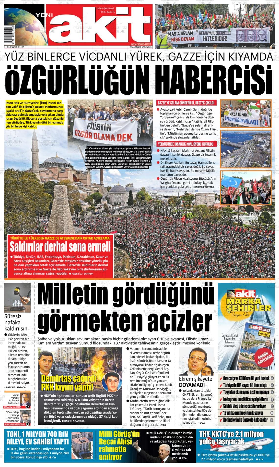 06 Ekim Pazartesi 2025 tarihli manşeti; YENİ AKİT gazetesi ilk sayfası