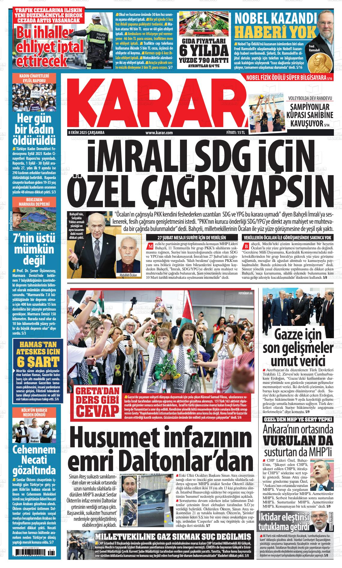 08 Ekim Çarşamba 2025 tarihli manşeti; KARAR gazetesi ilk sayfası