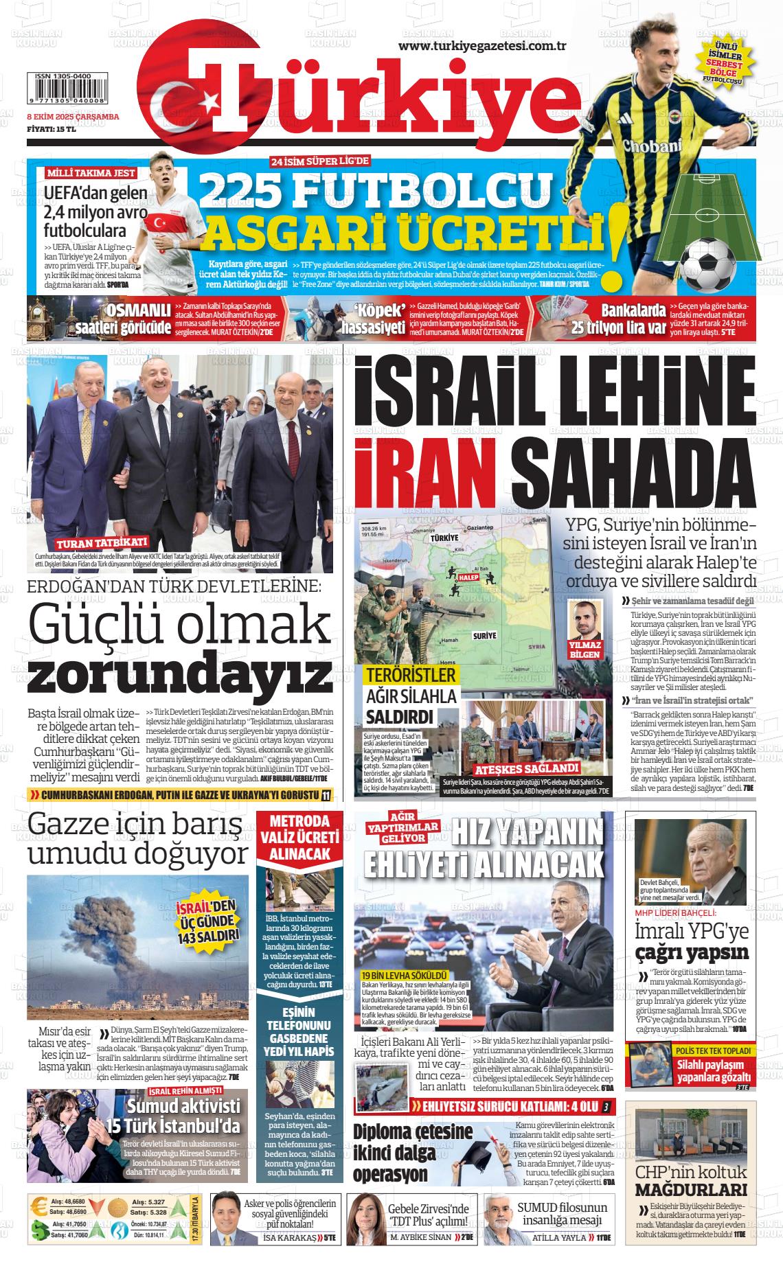 08 Ekim Çarşamba 2025 tarihli manşeti; TÜRKİYE gazetesi ilk sayfası