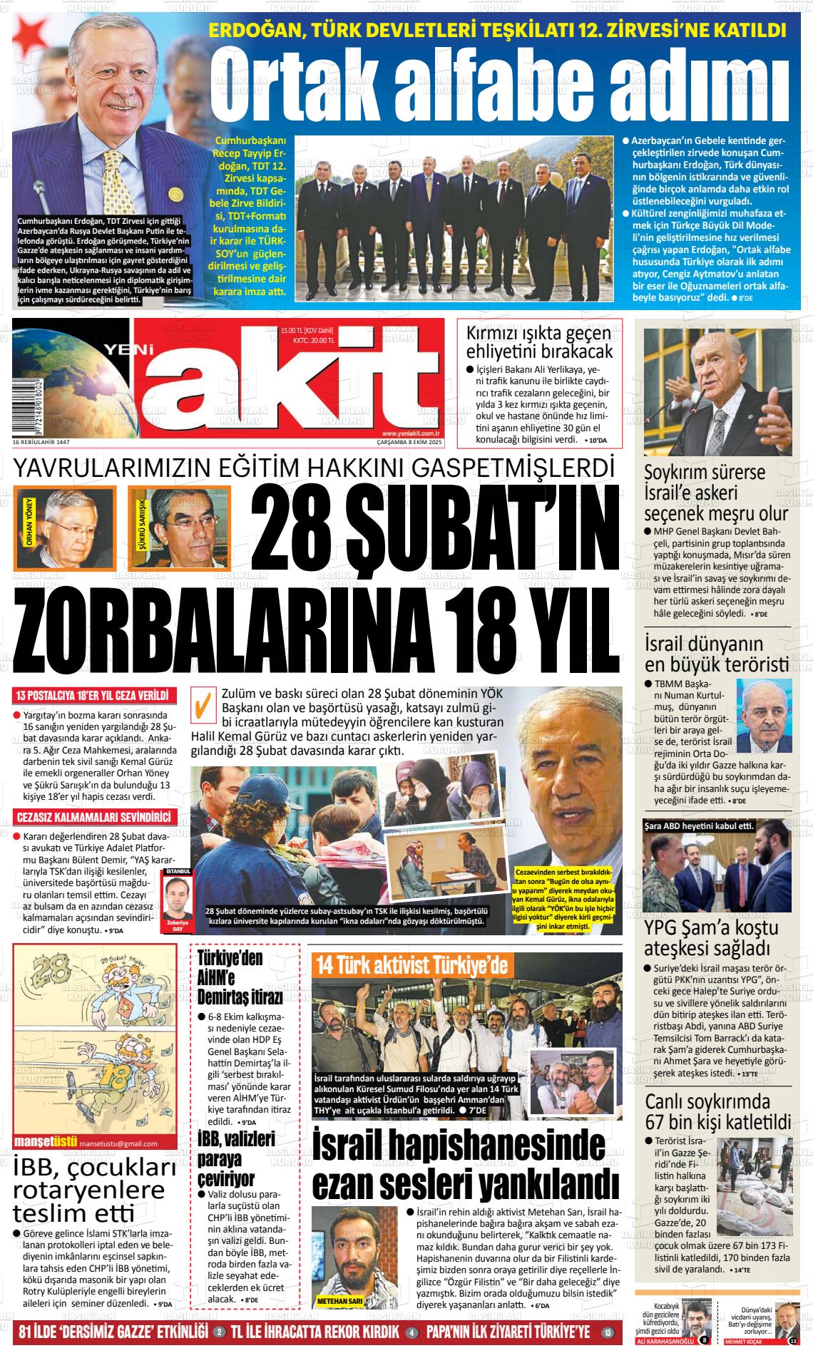 08 Ekim Çarşamba 2025 tarihli manşeti; YENİ AKİT gazetesi ilk sayfası