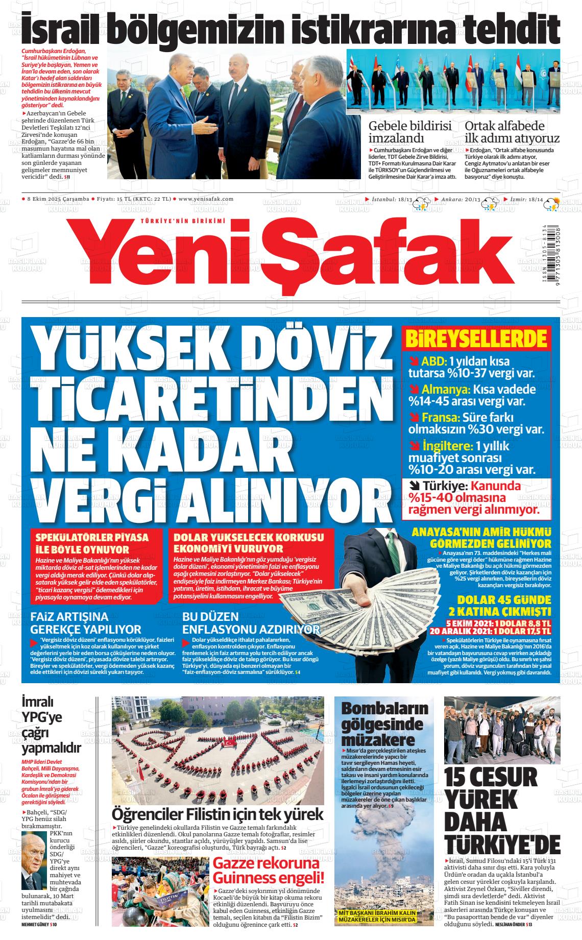 08 Ekim Çarşamba 2025 tarihli manşeti; YENİ ŞAFAK gazetesi ilk sayfası