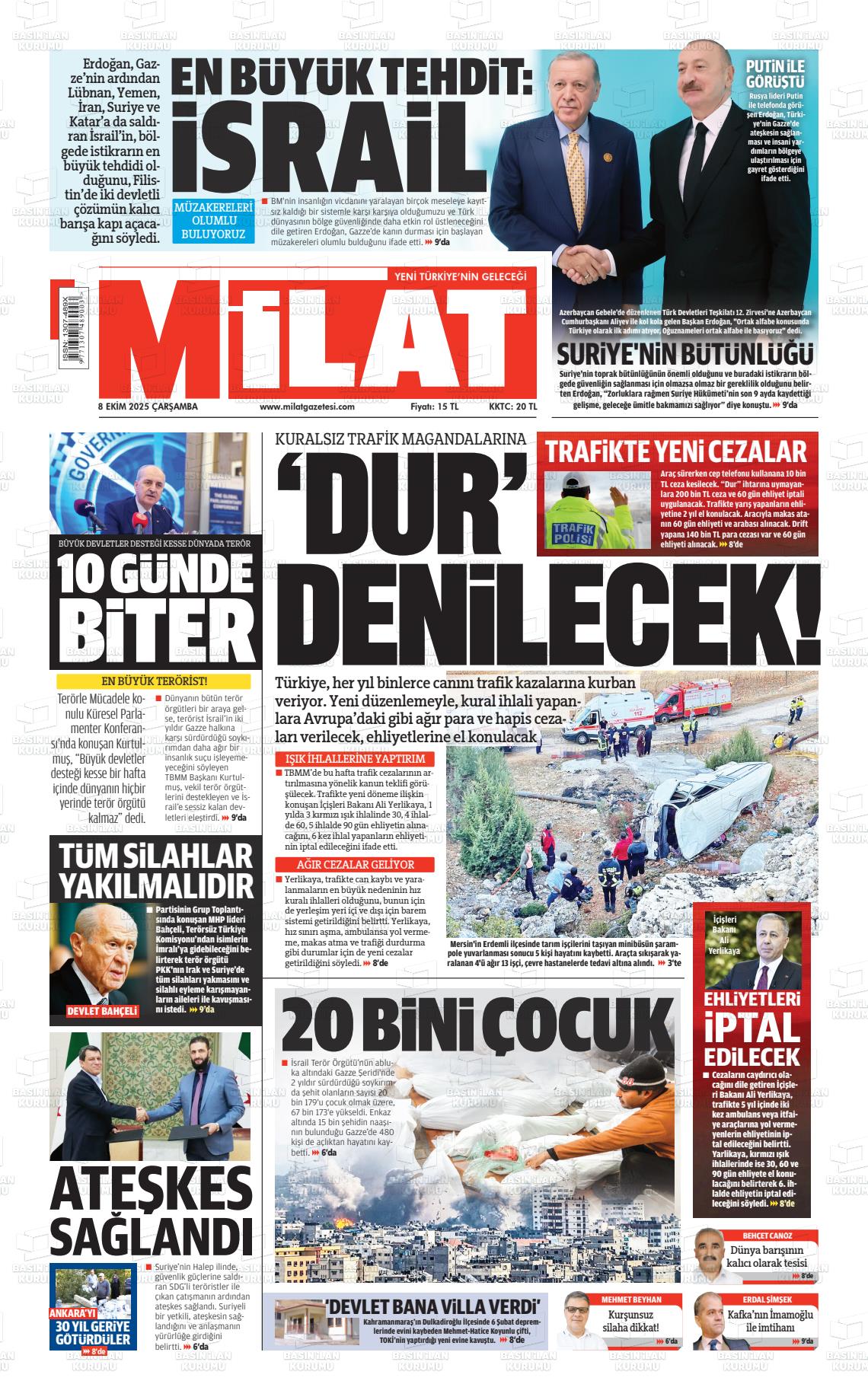 08 Ekim Çarşamba 2025 tarihli manşeti; MİLAT gazetesi ilk sayfası