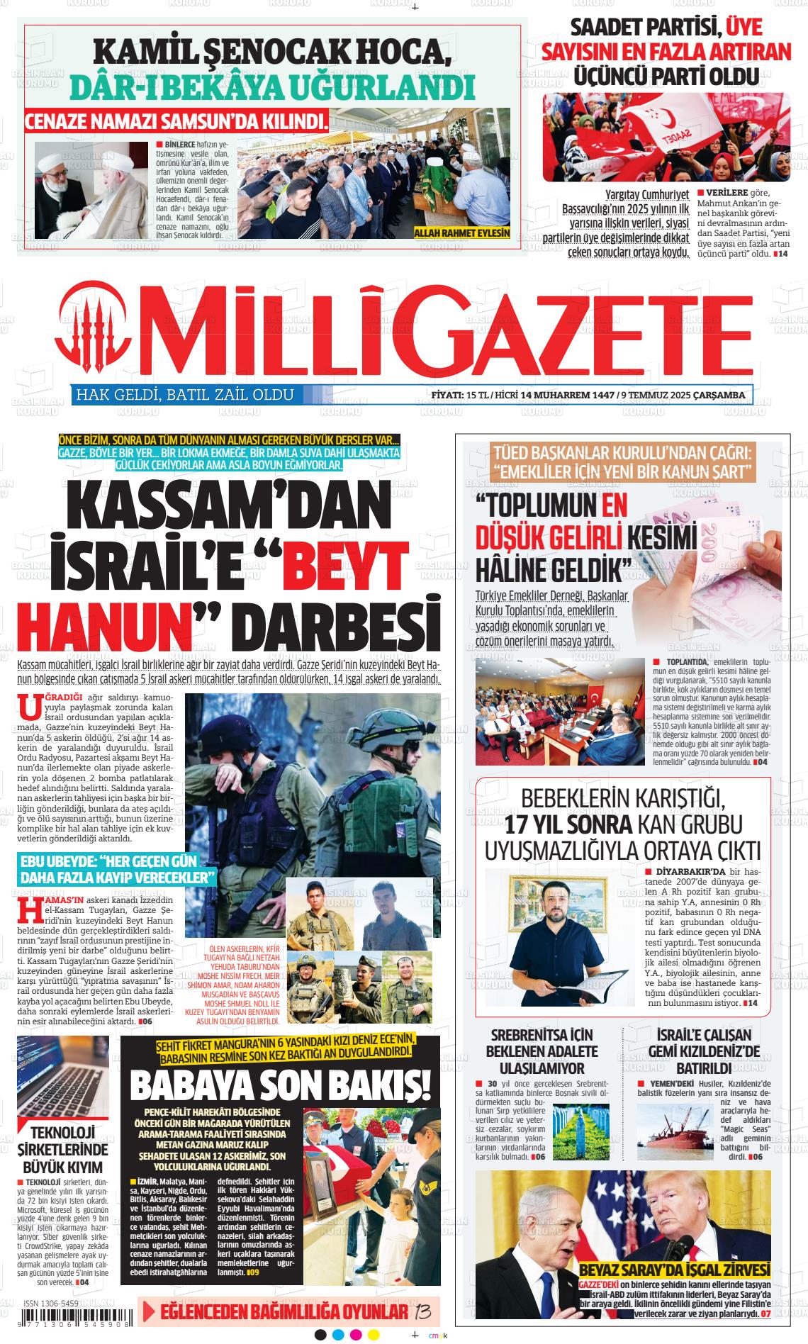 09 Temmuz Çarşamba 2025 tarihli manşeti; MİLLİ GAZETE gazetesi ilk sayfası