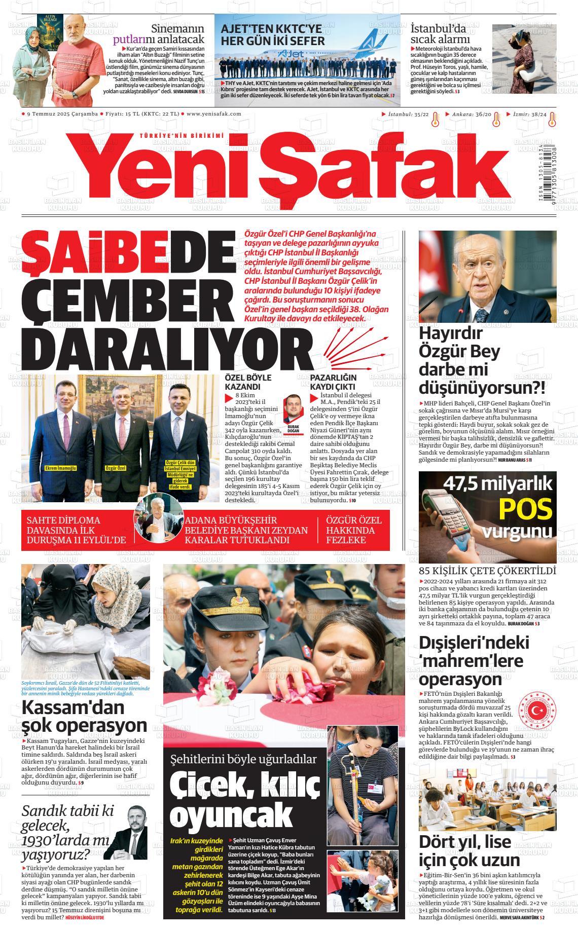 09 Temmuz Çarşamba 2025 tarihli manşeti; YENİ ŞAFAK gazetesi ilk sayfası