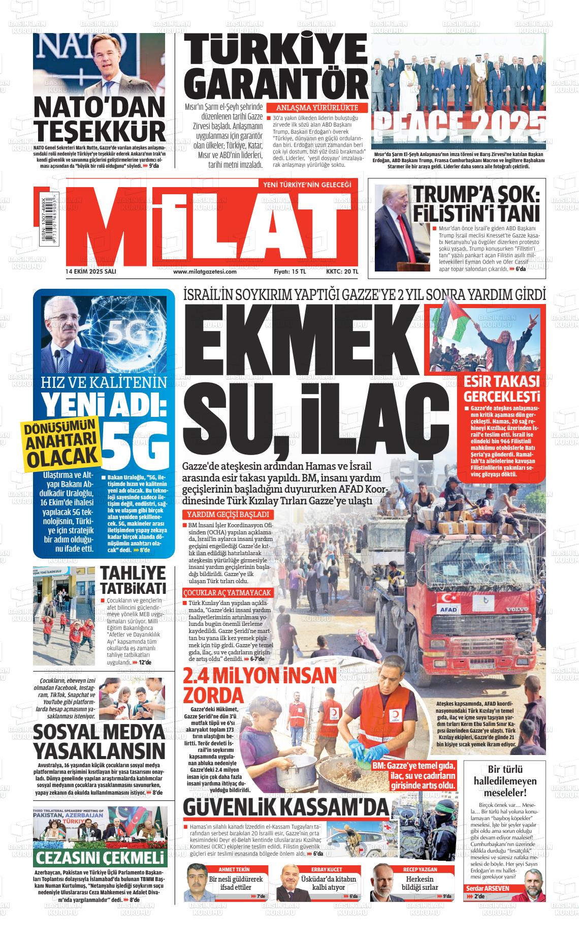 14 Ekim Salı 2025 tarihli manşeti; MİLAT gazetesi ilk sayfası