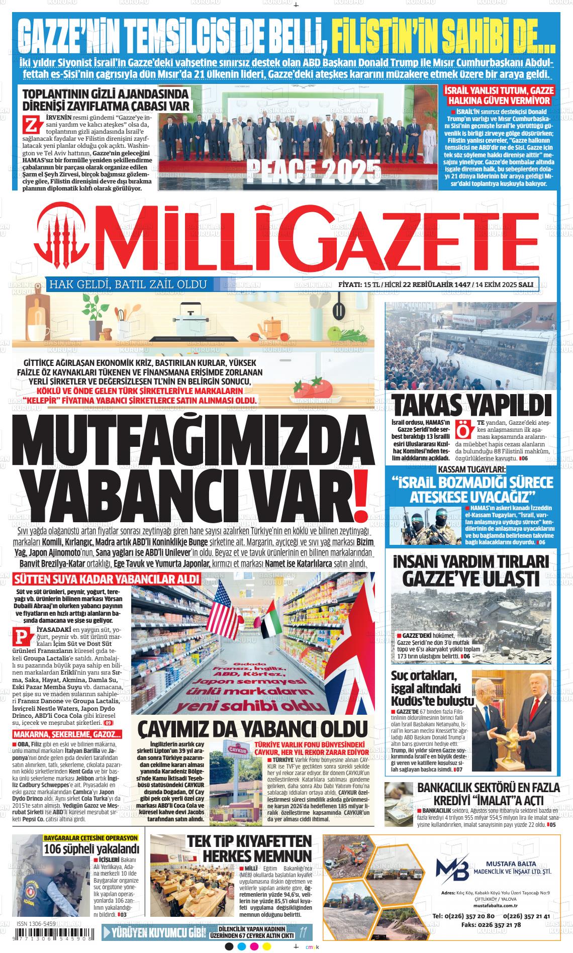14 Ekim Salı 2025 tarihli manşeti; MİLLİ GAZETE gazetesi ilk sayfası