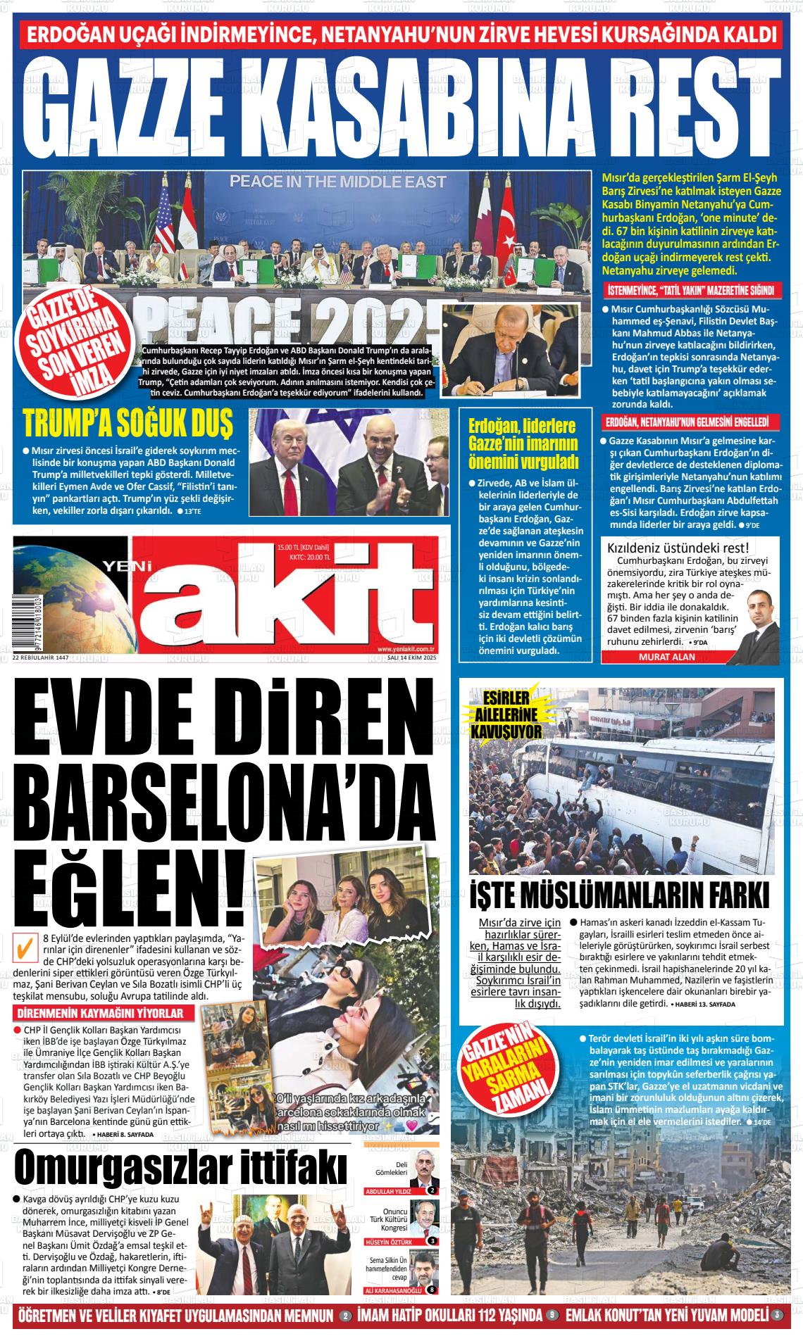 14 Ekim Salı 2025 tarihli manşeti; YENİ AKİT gazetesi ilk sayfası