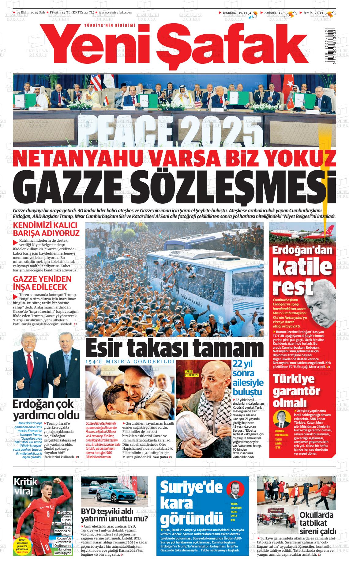 14 Ekim Salı 2025 tarihli manşeti; YENİ ŞAFAK gazetesi ilk sayfası