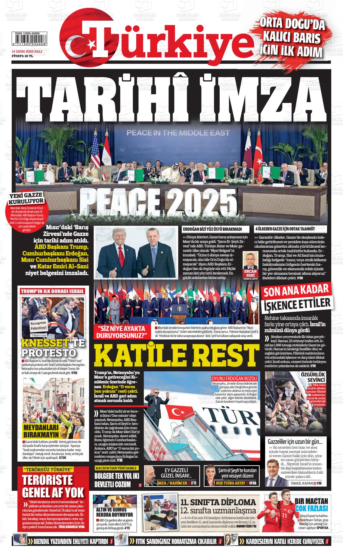 14 Ekim Salı 2025 tarihli manşeti; TÜRKİYE gazetesi ilk sayfası