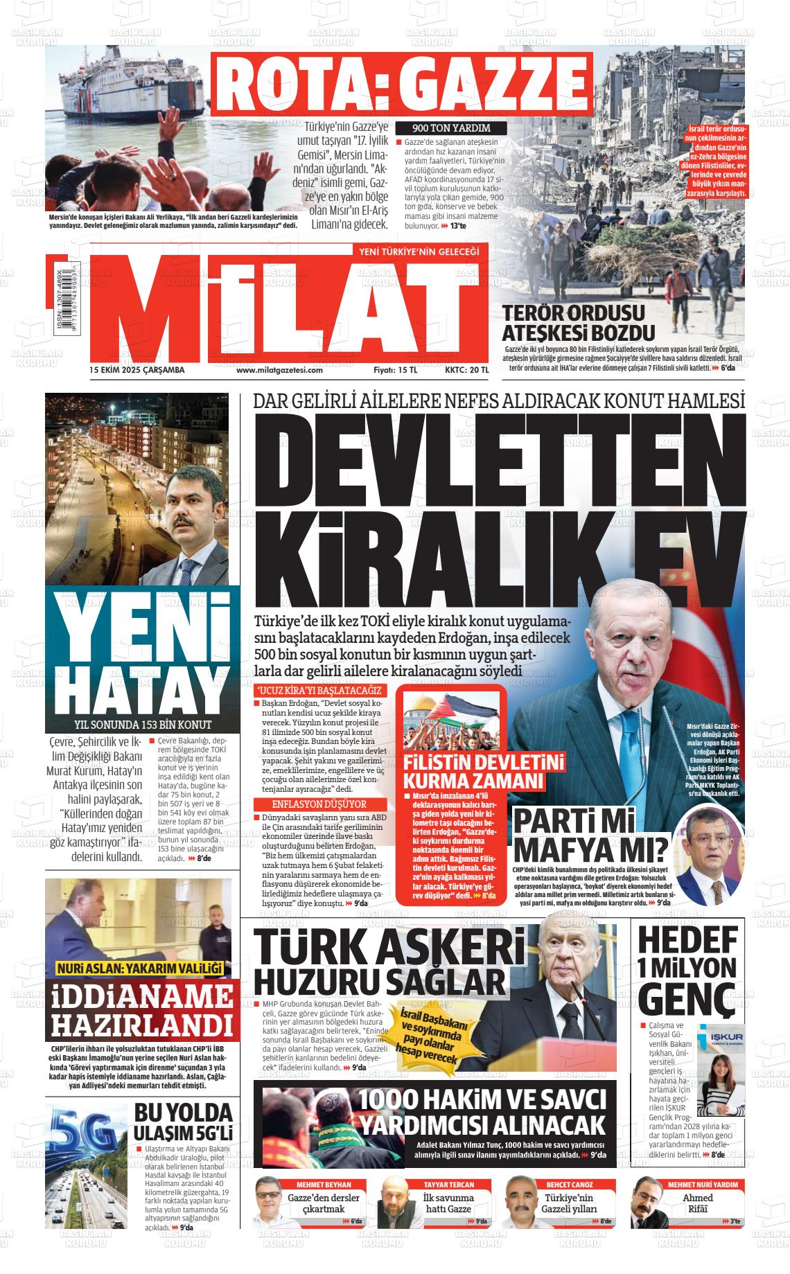 15 Ekim Çarşamba 2025 tarihli manşeti; MİLAT gazetesi ilk sayfası