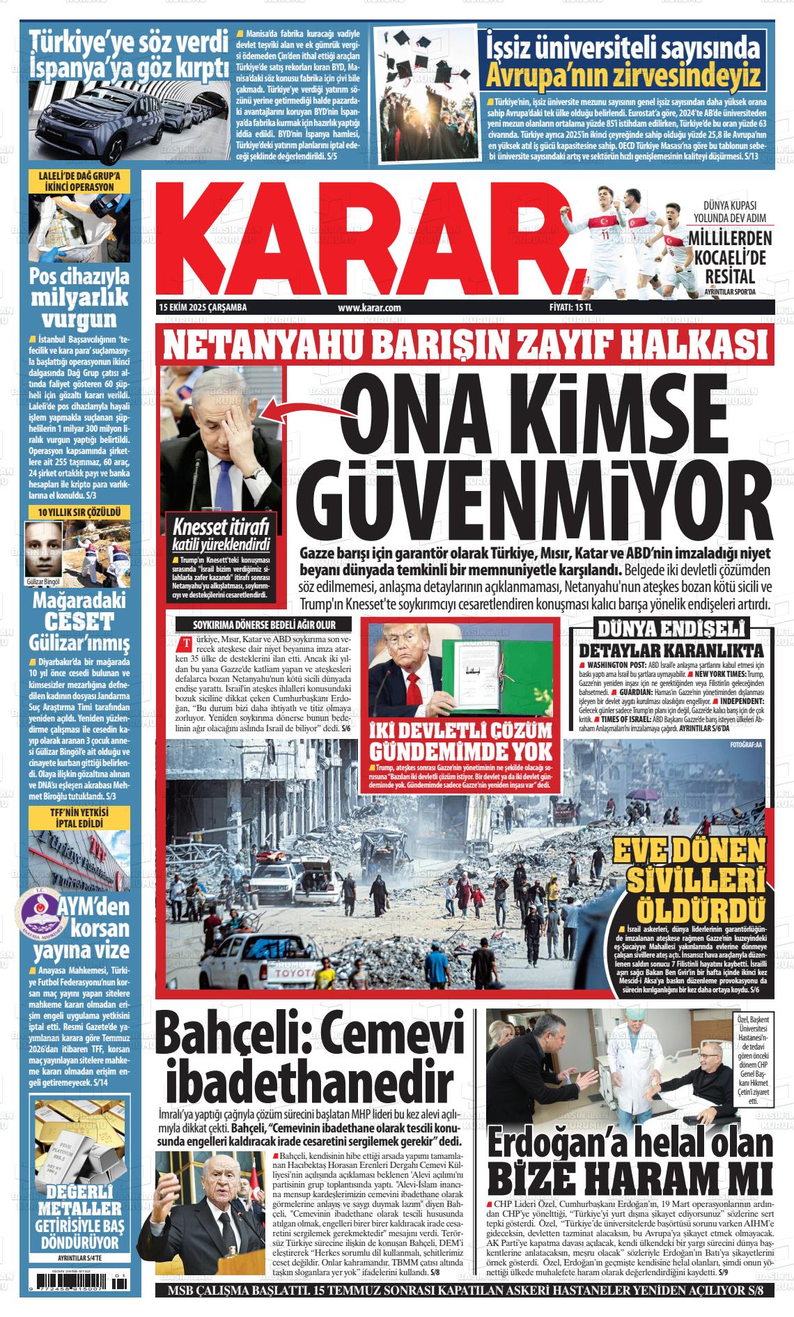 15 Ekim Çarşamba 2025 tarihli manşeti; KARAR gazetesi ilk sayfası
