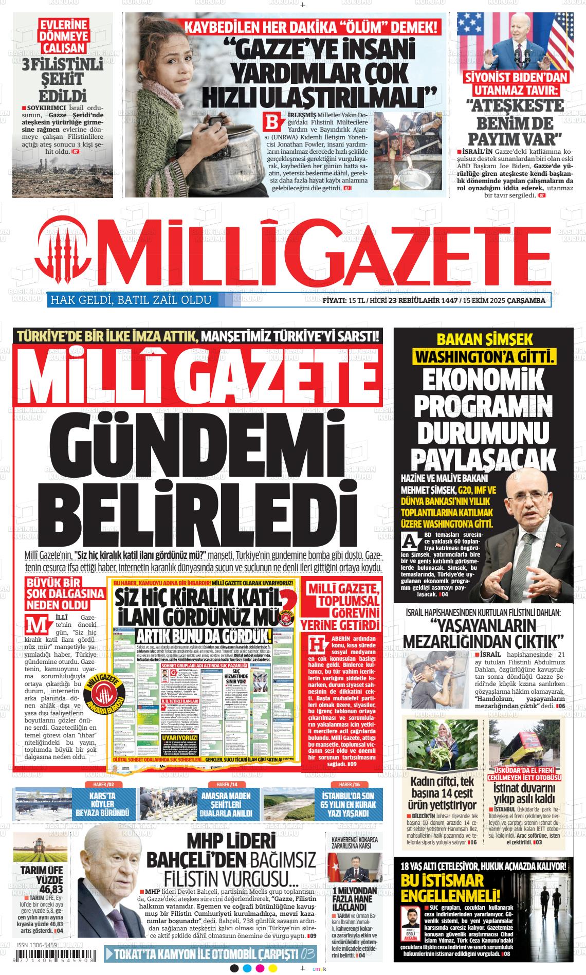 15 Ekim Çarşamba 2025 tarihli manşeti; MİLLİ GAZETE gazetesi ilk sayfası