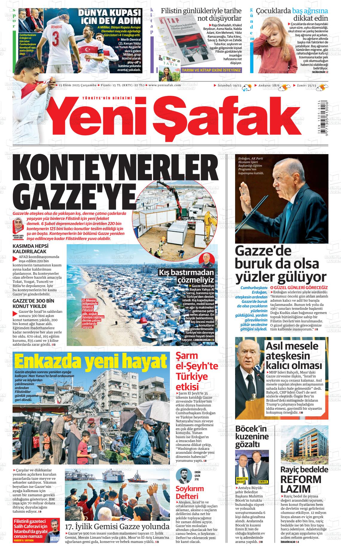 15 Ekim Çarşamba 2025 tarihli manşeti; YENİ ŞAFAK gazetesi ilk sayfası