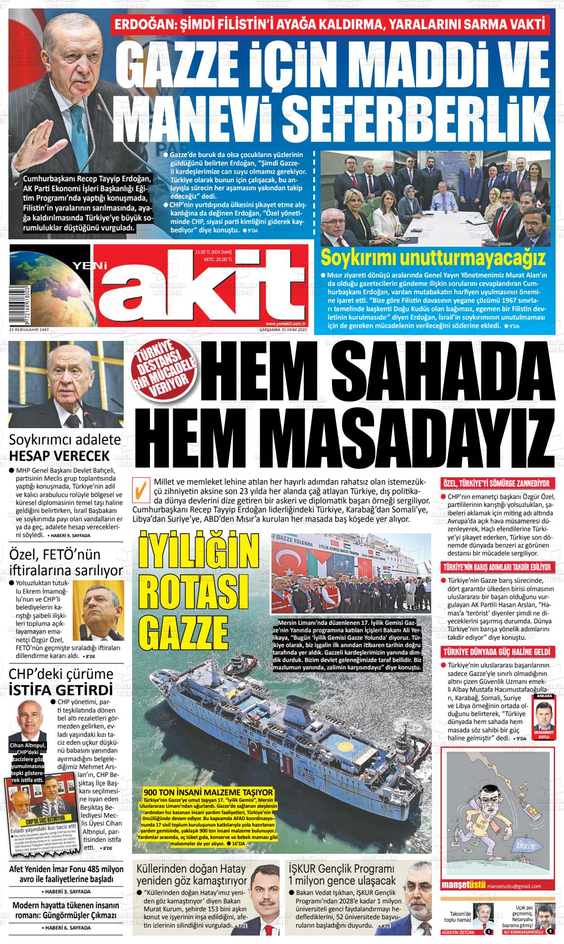 15 Ekim Çarşamba 2025 tarihli manşeti; YENİ AKİT gazetesi ilk sayfası
