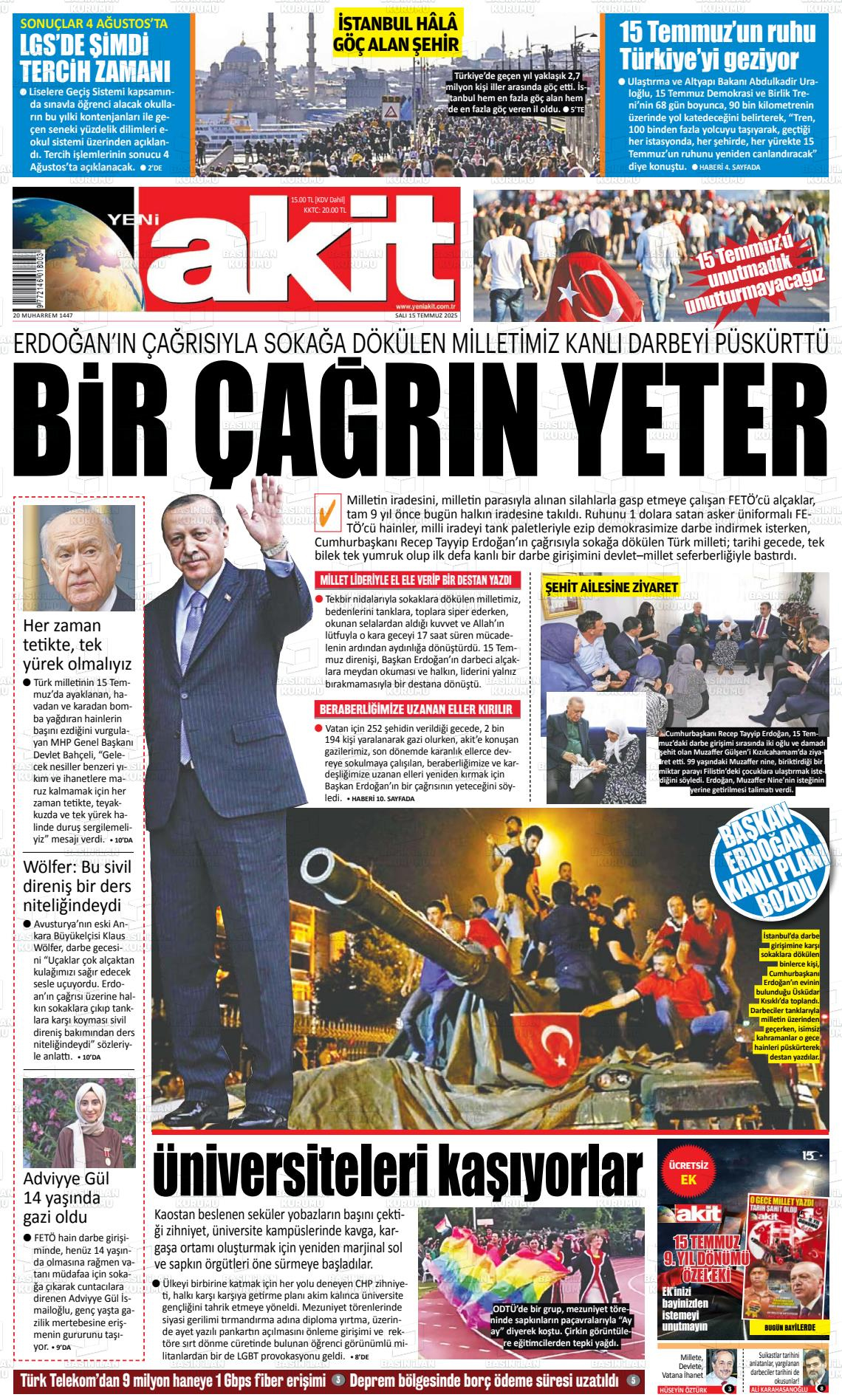 15 Temmuz Salı 2025 tarihli manşeti; YENİ AKİT gazetesi ilk sayfası