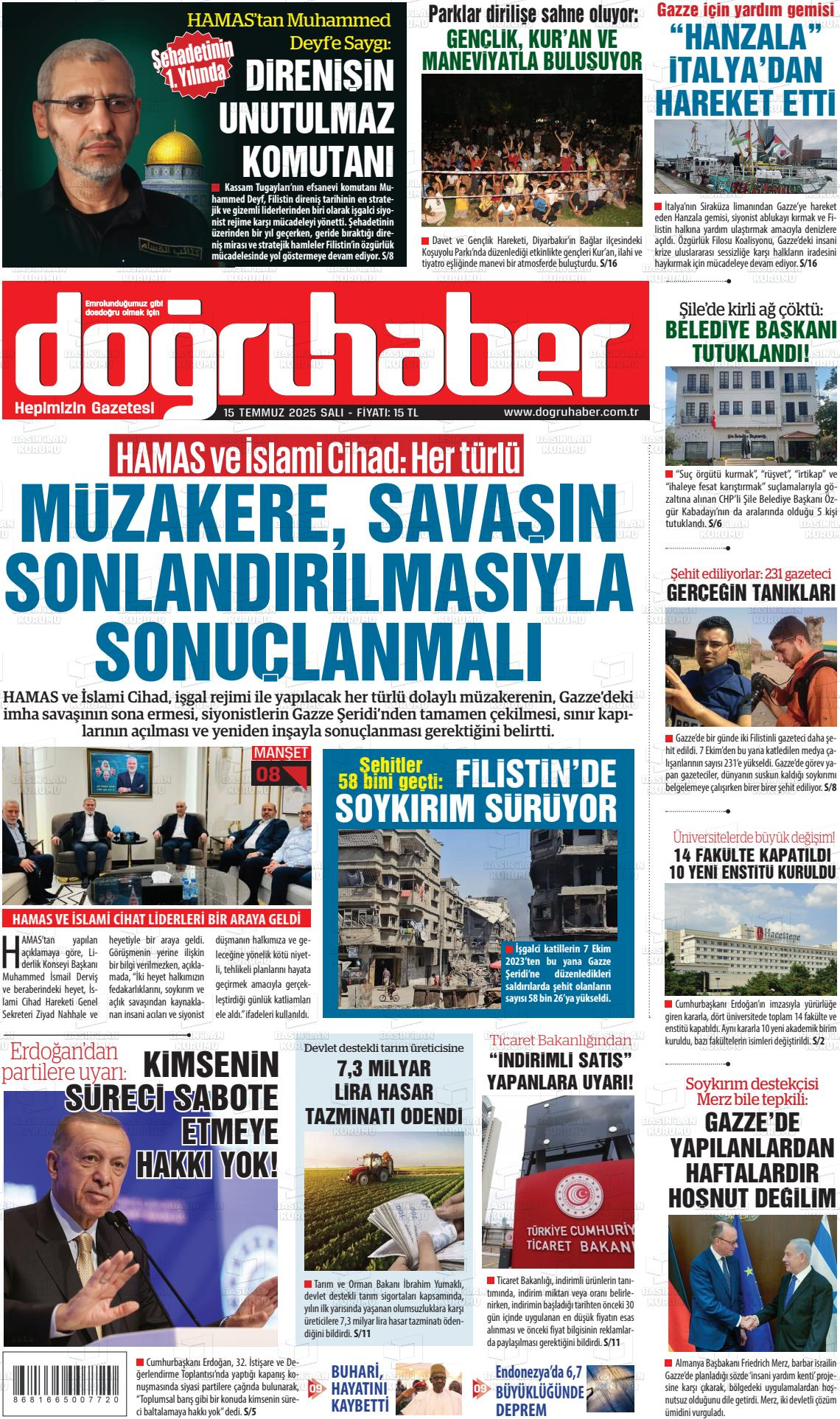 15 Temmuz Salı 2025 tarihli manşeti; DOĞRUHABER gazetesi ilk sayfası