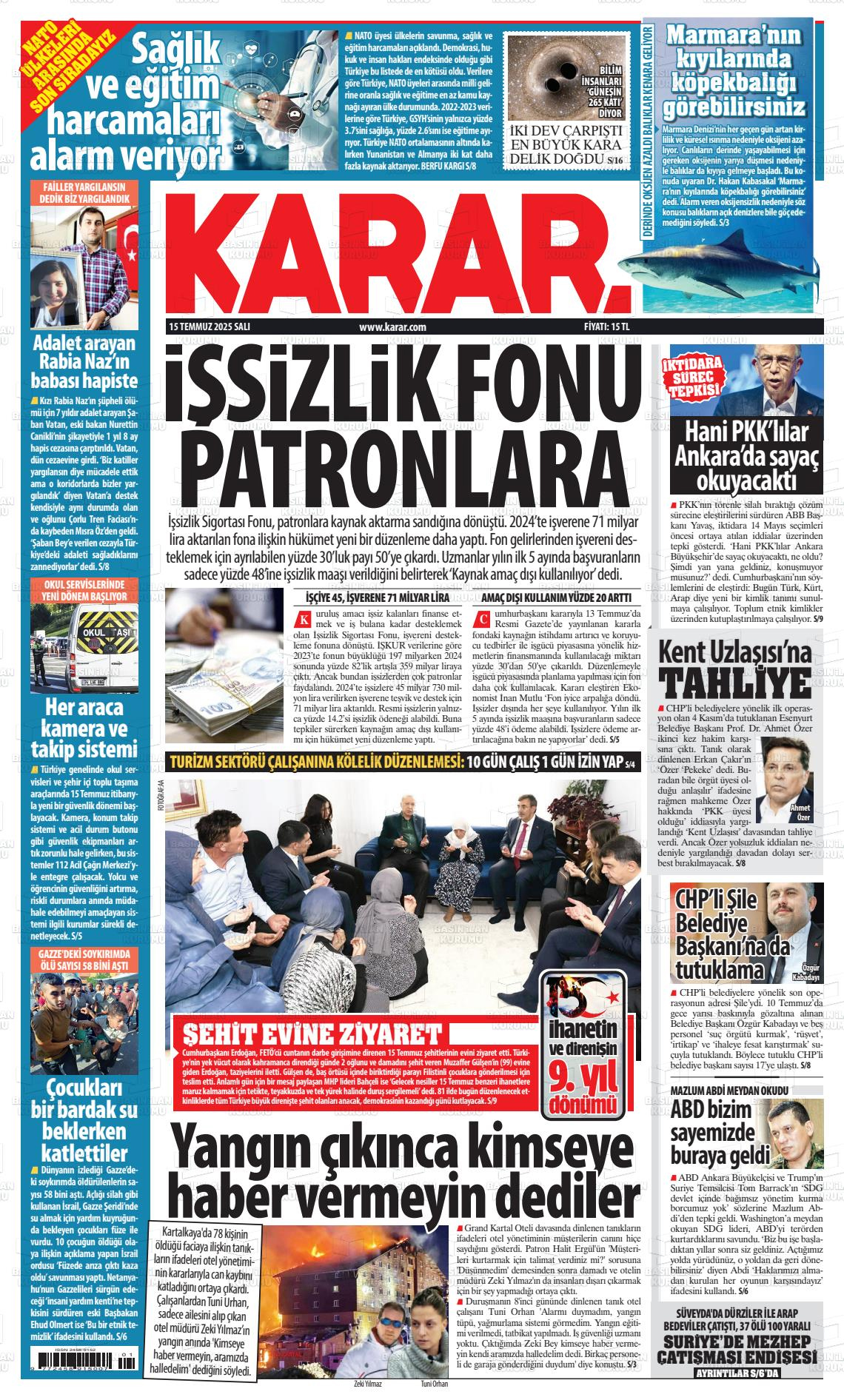 15 Temmuz Salı 2025 tarihli manşeti; KARAR gazetesi ilk sayfası