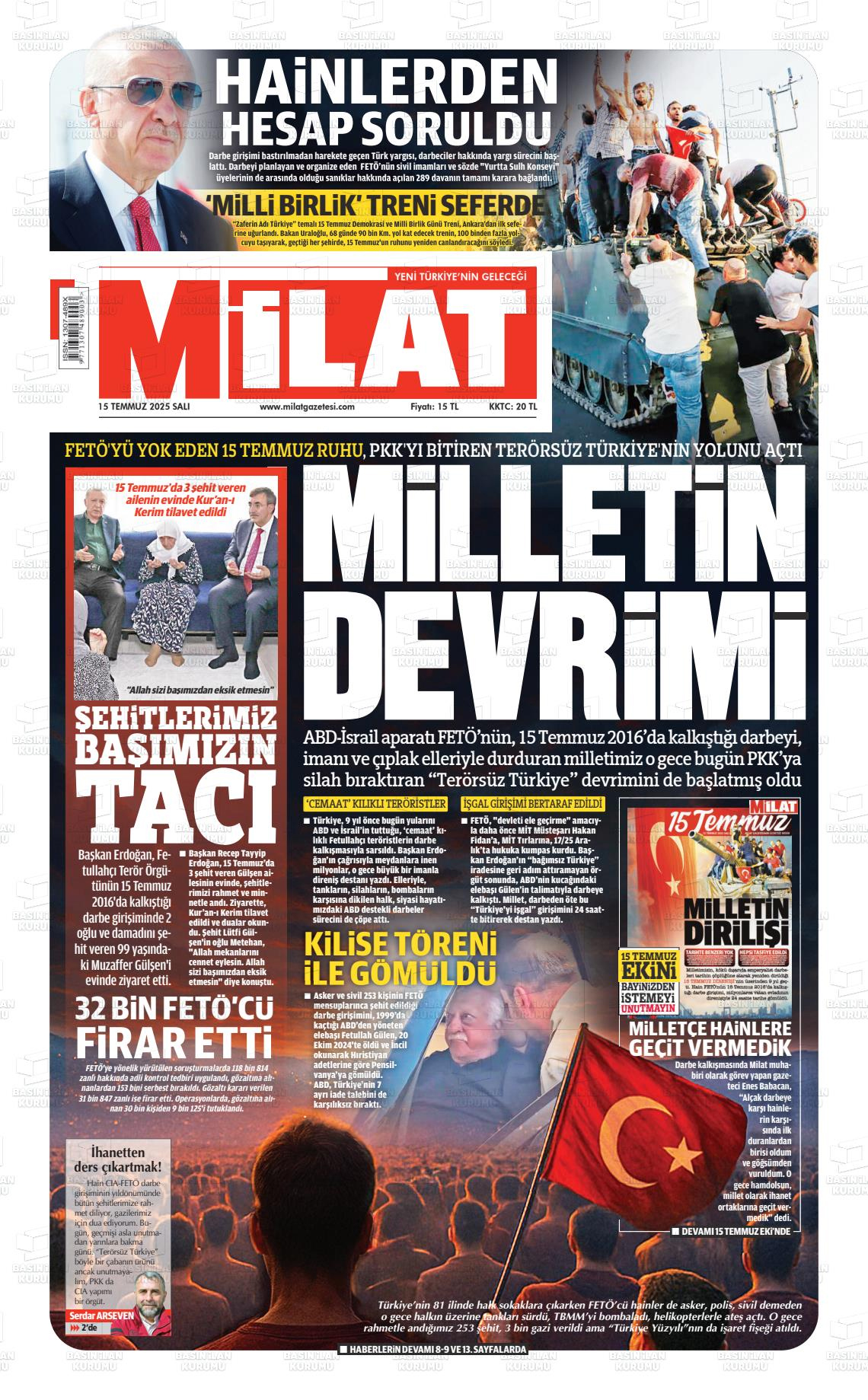 15 Temmuz Salı 2025 tarihli manşeti; MİLAT gazetesi ilk sayfası