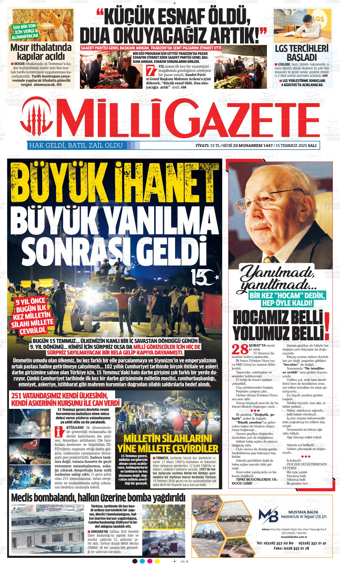 15 Temmuz Salı 2025 tarihli manşeti; MİLLİ GAZETE gazetesi ilk sayfası