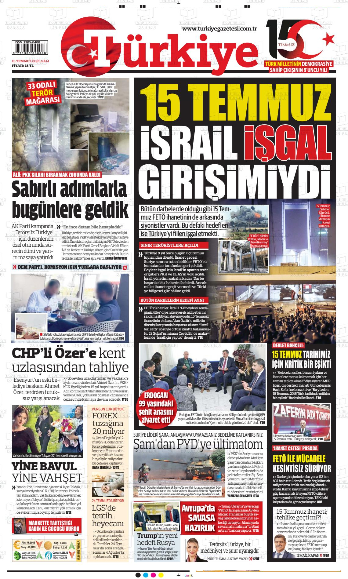 15 Temmuz Salı 2025 tarihli manşeti; TÜRKİYE gazetesi ilk sayfası
