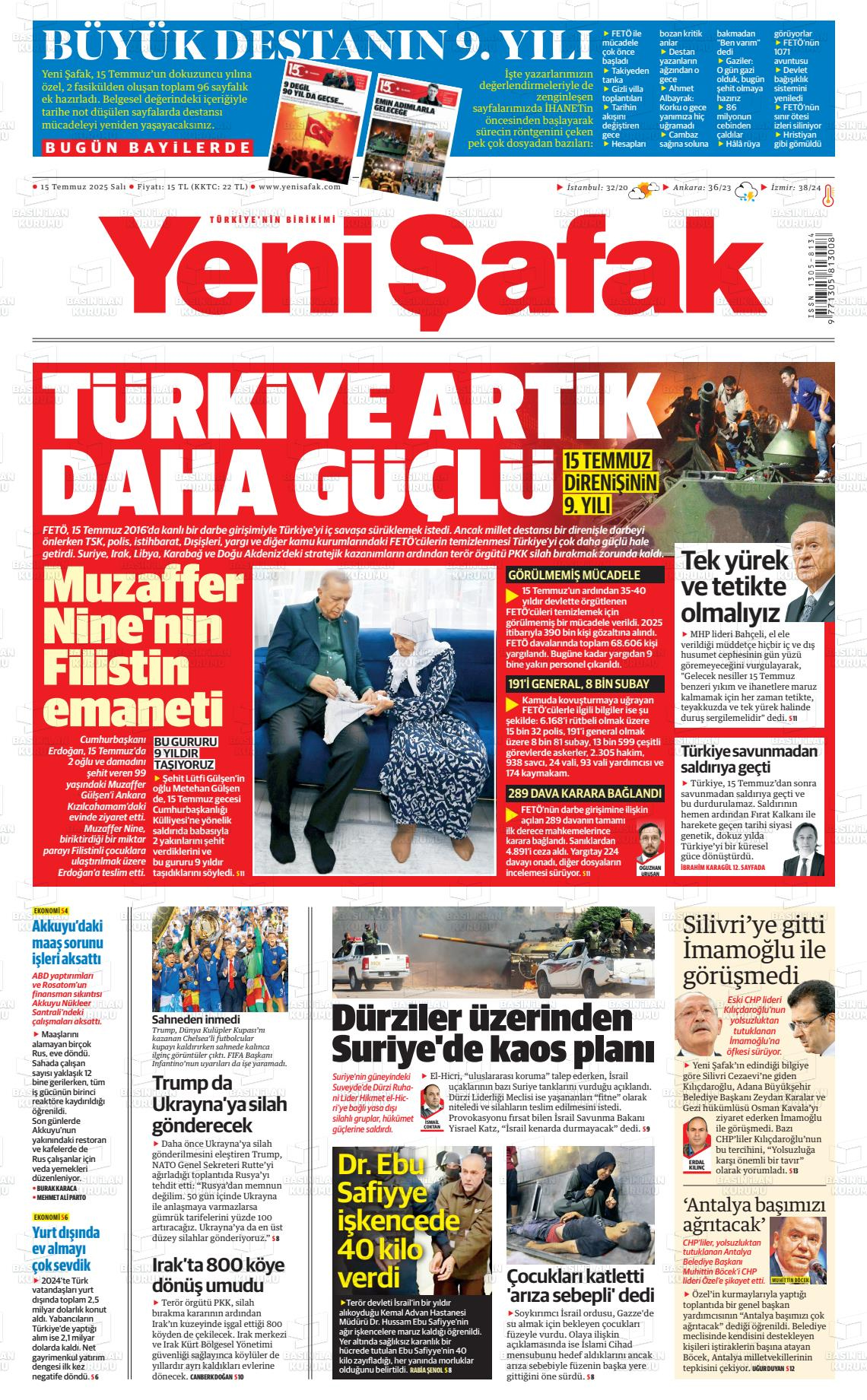 15 Temmuz Salı 2025 tarihli manşeti; YENİ ŞAFAK gazetesi ilk sayfası