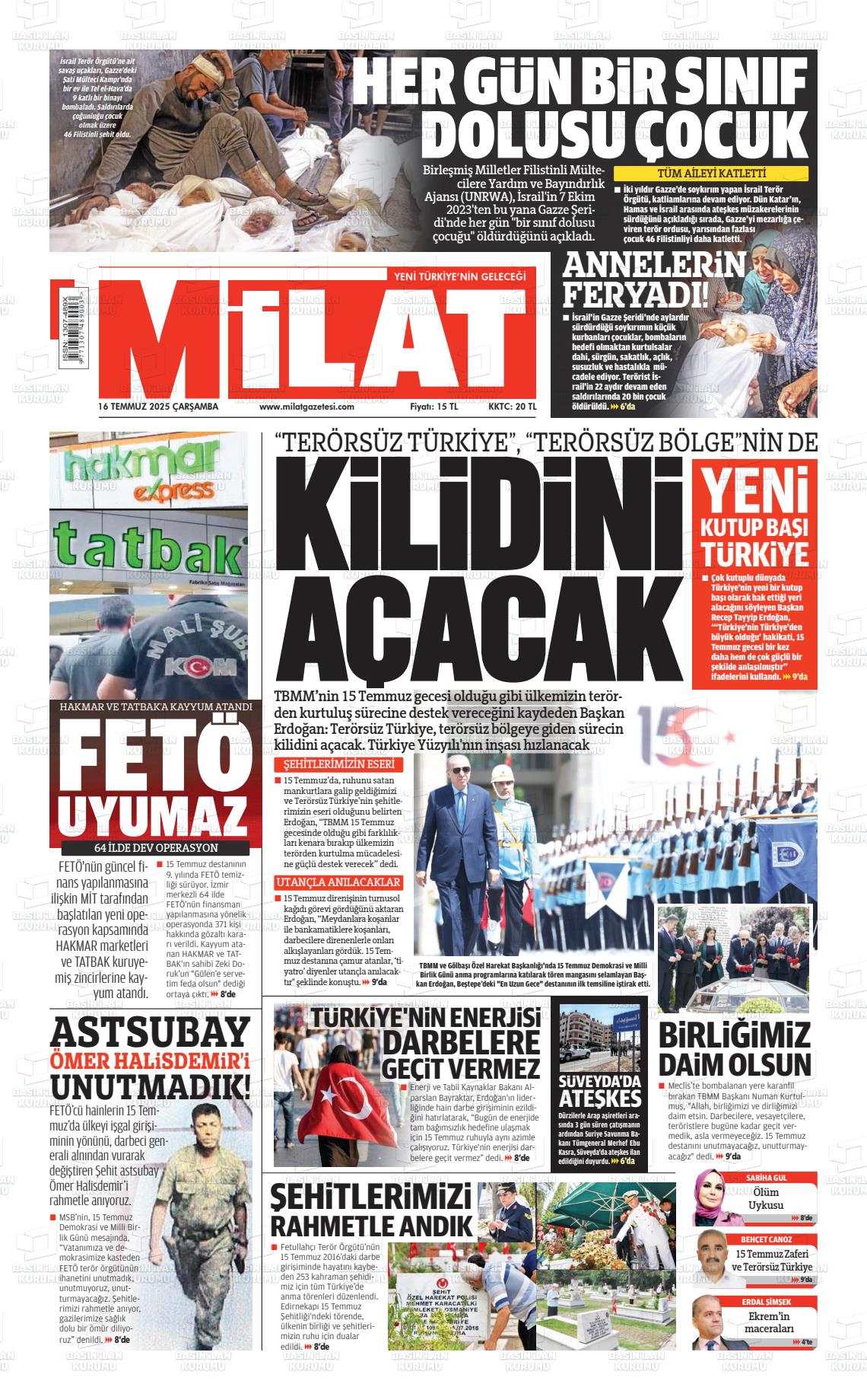 16 Temmuz Çarşamba 2025 tarihli manşeti; MİLAT gazetesi ilk sayfası