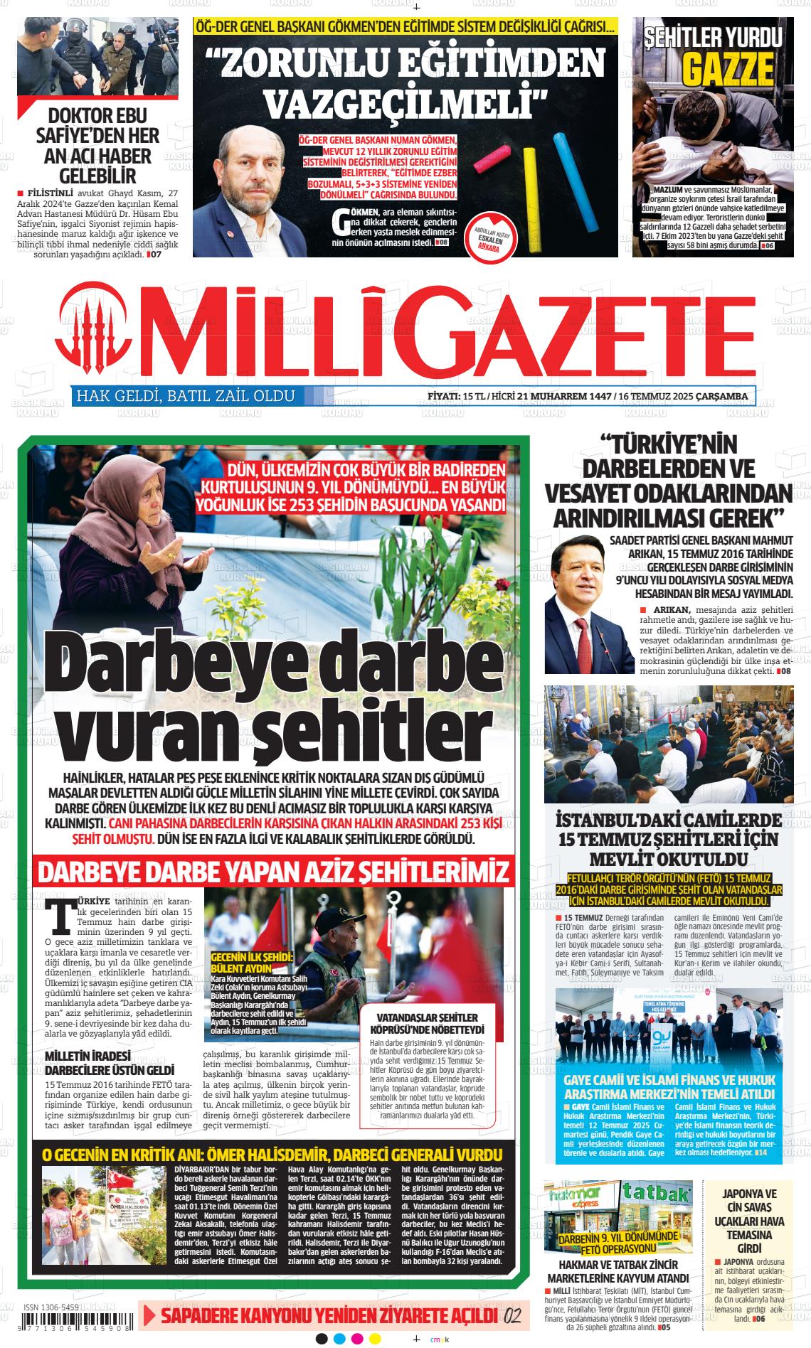 16 Temmuz Çarşamba 2025 tarihli manşeti; MİLLİ GAZETE gazetesi ilk sayfası