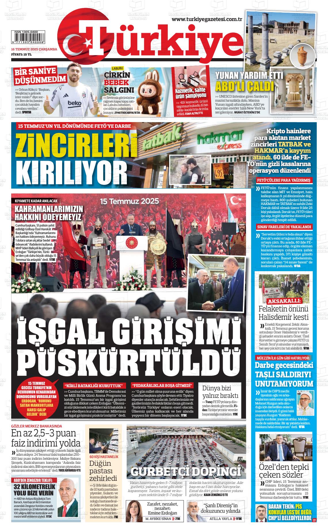 16 Temmuz Çarşamba 2025 tarihli manşeti; TÜRKİYE gazetesi ilk sayfası