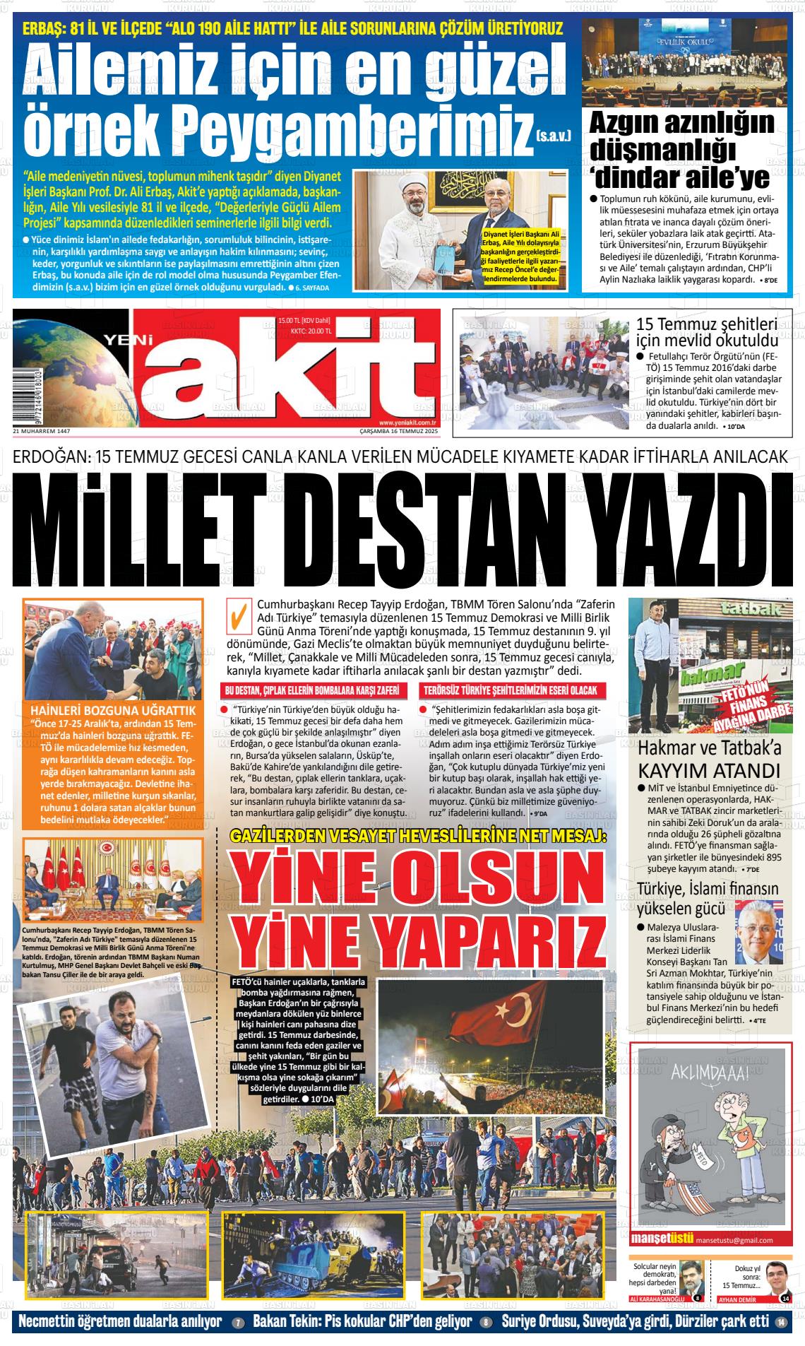16 Temmuz Çarşamba 2025 tarihli manşeti; YENİ AKİT gazetesi ilk sayfası