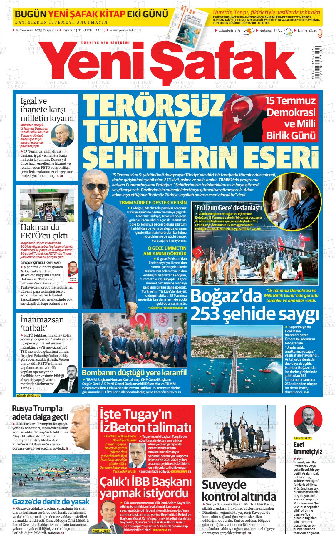 16 Temmuz Çarşamba 2025 tarihli manşeti; YENİ ŞAFAK gazetesi ilk sayfası