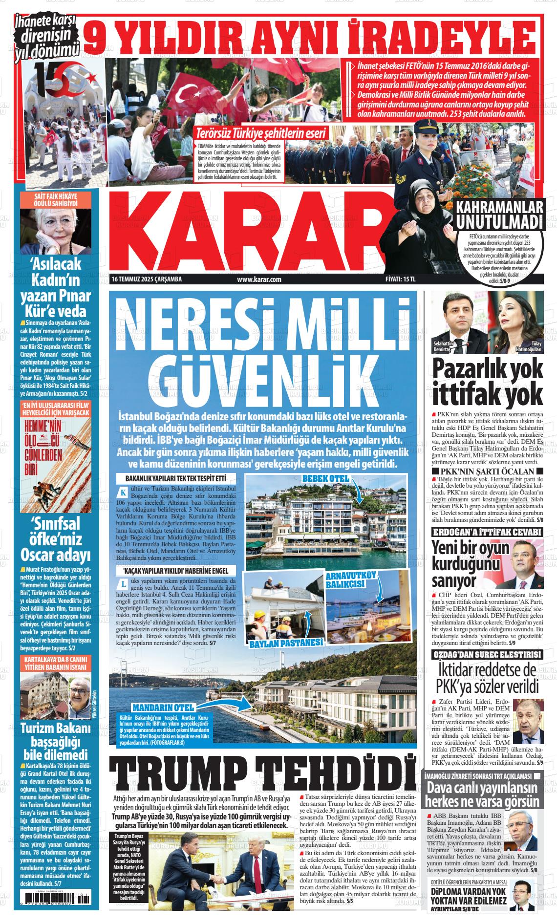 16 Temmuz Çarşamba 2025 tarihli manşeti; KARAR gazetesi ilk sayfası