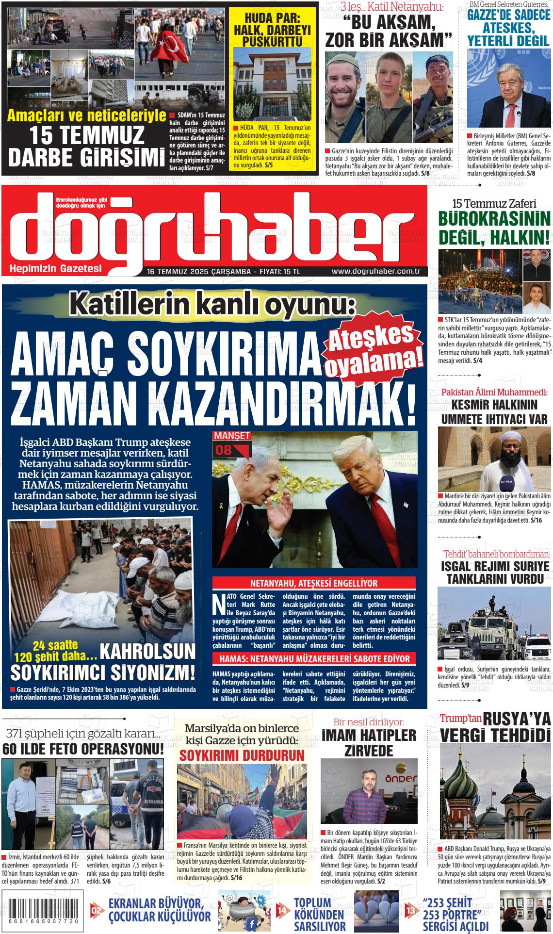 16 Temmuz Çarşamba 2025 tarihli manşeti; DOĞRUHABER gazetesi ilk sayfası