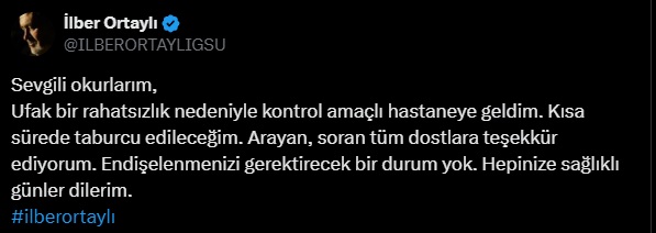 Prof. Dr. Ortaylı da doğrudan sosyal medya üzerinden açıklama yaptı. Ortaylı yayınladığı mesaj şöyle: