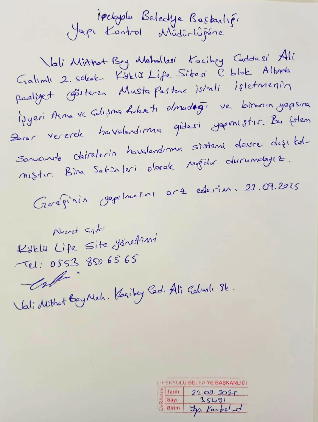 Vali Mithat Bey Mahallesi Koçibey Caddesi Ali Çalımlı 2. Sokak’ta bulunan Köklü Life Sitesi C Blok altında faaliyet gösteren söz konusu işletmenin bina yapısına müdahalede bulunarak havalandırma gideri açtığı, bu nedenle de dairelerin ortak havalandırma sisteminin devre dışı kaldığı öne sürüldü.