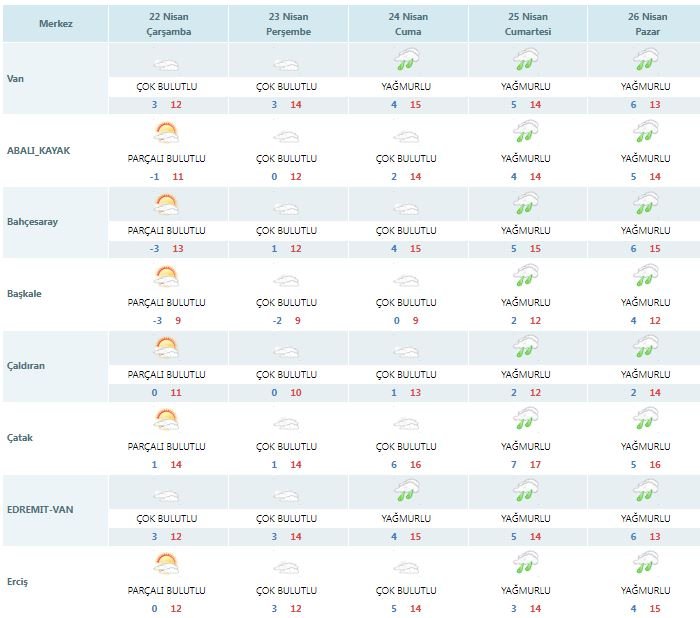 22 Nisan Çarşamba günü Çok bulutlu hava beklenirken, 24 Nisan Cuma günü sağanak yağışlı öngörülüyor. 25 Nisan Pazar gününe kadar yağışın devam etmesi bekleniyor.