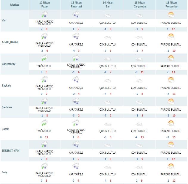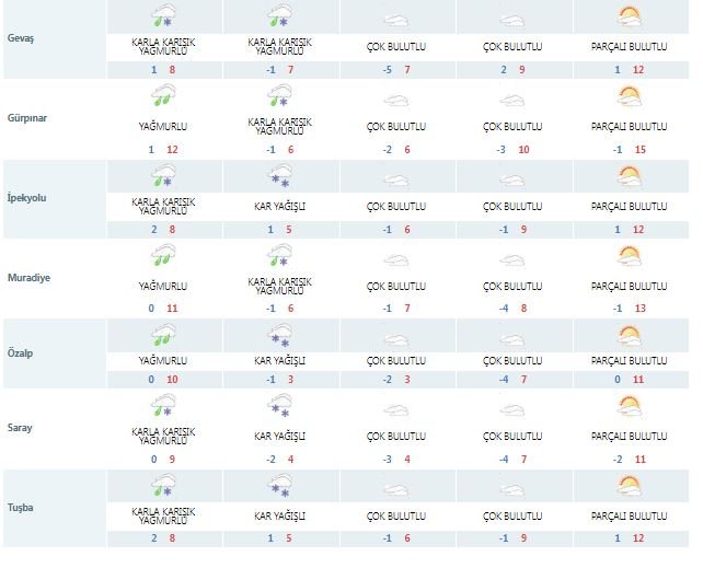 Meteoroloji verilerine göre Van’da Parçalı ve çok bulutlu, aralıklı karla karışık yağmur ve kar yağışlı olması bekleniyor. Günün en düşük sıcaklığı 2, en yüksek sıcaklığı ise 9 derece olacak.