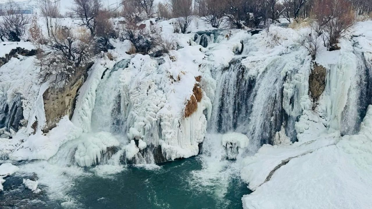 Hava sıcaklığının gece saatlerinde eksi 12 dereceye kadar düşmesiyle birlikte Muradiye Şelalesi’nin büyük bir bölümü donarak kartpostallık görüntüler oluşturdu.