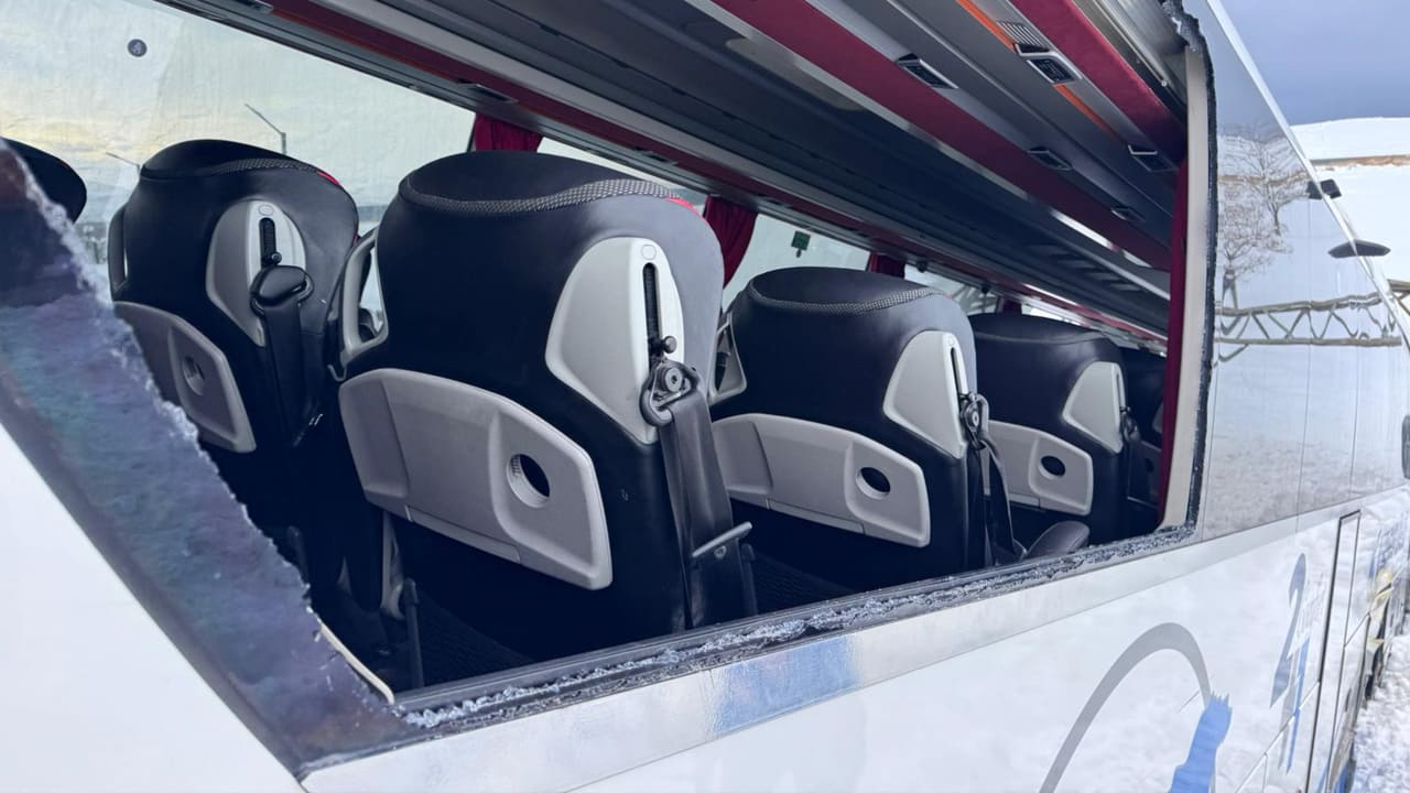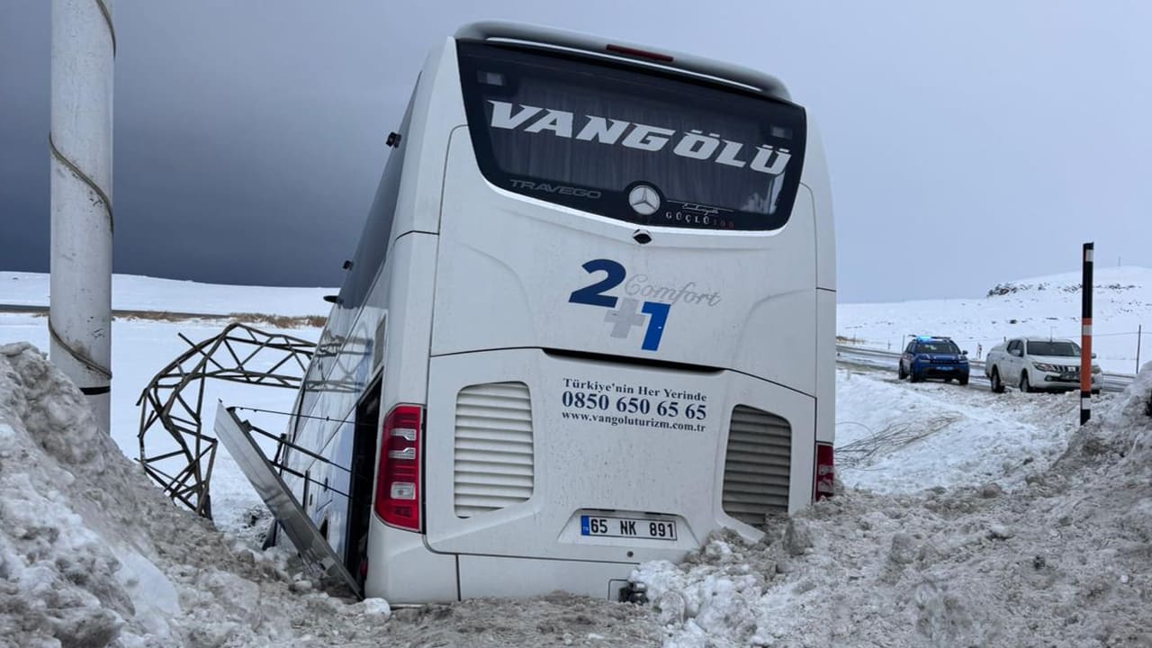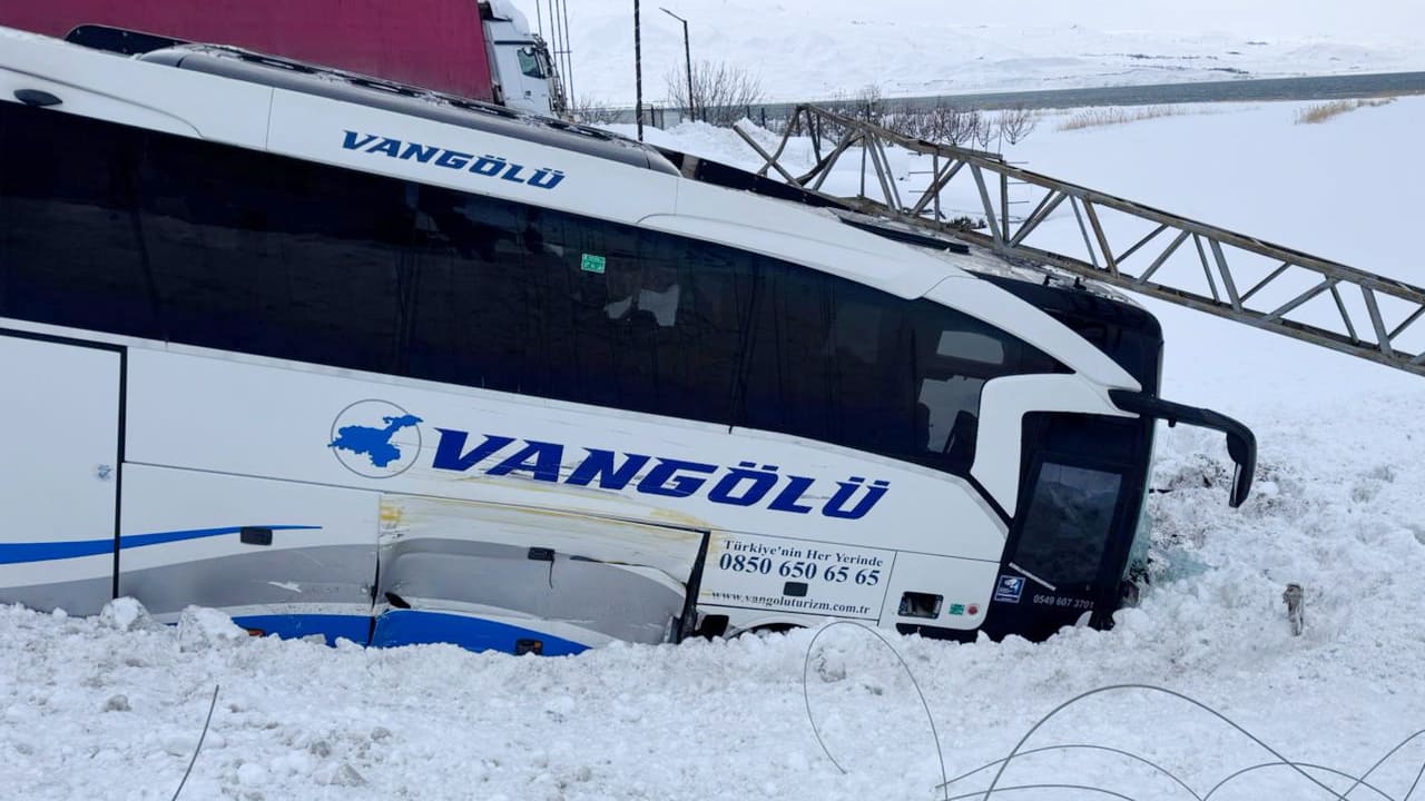 Bir yolcu otobüsü ile bir karayolu aracı olumsuz hava ve yol şartları nedeniyle kazaya karıştı. Kayganlaşan yolda kontrolden çıkan otobüs elektrik direğine çarparak durabildi.