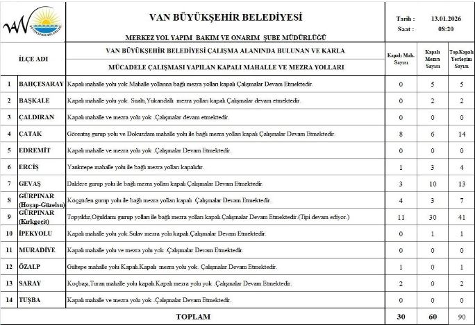 Van Büyükşehir Belediyeden yapılan açıklamaya göre, 13 Ocak 2026 tarihi itibarıyla Van genelinde 30 mahalle yolu ve 60 mezra yolu olmak üzere toplam 90 yerleşim yerinin yolu ulaşıma kapalı bulunuyor.