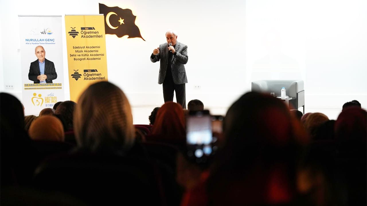 Van Valiliği, Van Büyükşehir Belediyesi ve Van Öğretmen Akademileri iş birliğiyle Merkez İmam Hatip Lisesi Konferans Salonunda düzenlenen programda Şair-Yazar Nurullah Genç, öğretmenlerle bir araya geldi.